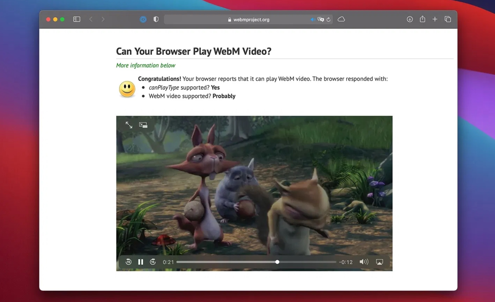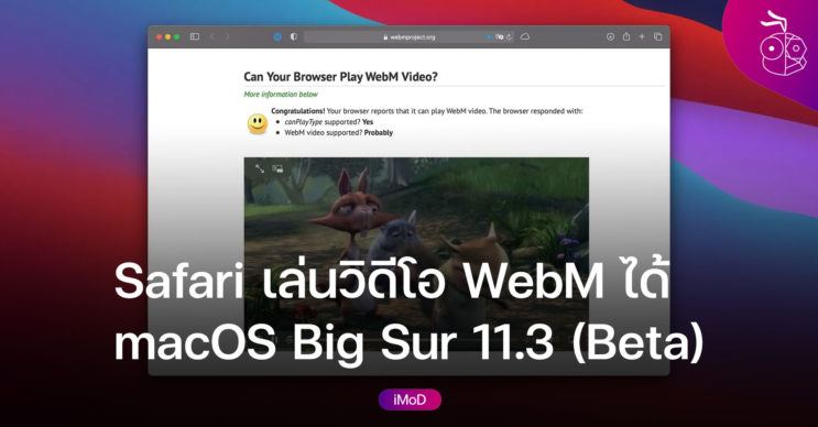 ปกติแล้ว Safari จะไม่สามารถเล่นวิดีโอ WebM ได้ แต่ใน macOS Big Sur 11.3 Beta 2, Safari สามารถเล่นวิดีโอ WebM ได้แล้ว