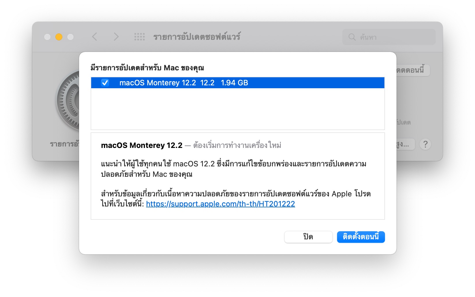รายละเอียดอัปเดตความปลอดภัยของ macOS Monterey 12.2 นั้นได้อุดช่องโหว่และอัปเดตความปลอดภัยไปมากกว่า 15 รายการ สามารถตรวจสอบข้อมูลได้ที่นี่ : https://support.apple.com/th-th/HT213054