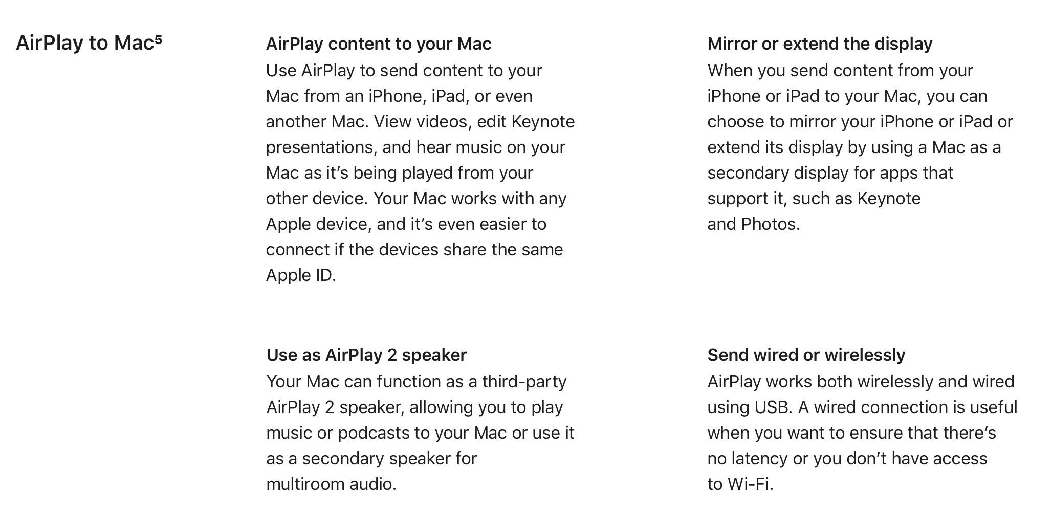 ที่น่าสนใจ คือ สามารถส่งหน้าจอจาก Mac ไปแสดงผลที่ Mac อีกเครื่องได้ด้วย นั่นหมายความว่าผู้ใช้ Mac จะสามารถใช้ Mac อีกเครื่องเป็นจอเสริมได้ ทั้งสตรีมวิดีโอ แก้งาน Keynote และอื่น ๆ โดย AirPlay to Mac นั้น รองรับการทำงานทั้งแบบไร้สายและเชื่อมต่อผ่านสาย (ต้องใช้ Apple ID เดียวกัน)