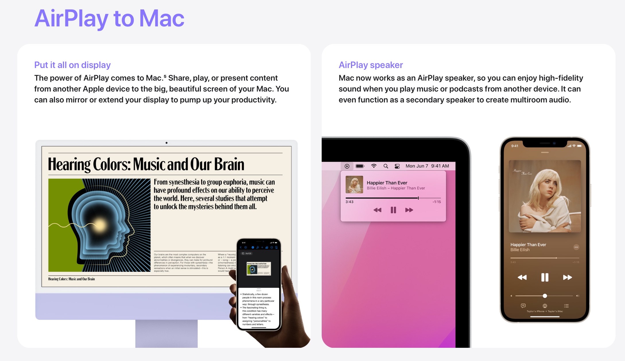 นอกจากนั้น macOS Monterey ยัง AirPlay 2 เสียงไปยัง Mac เพื่อเป็นลำโพงได้ หมายความว่า ผู้ใช้สามารถส่งเสียงเพลงจากอุปกรณ์ต่าง ๆ เช่น iPhone มาเล่นที่ Mac เพื่อใช้ Mac เป็นลำโพงในการเล่นเพลงได้นั่นเอง