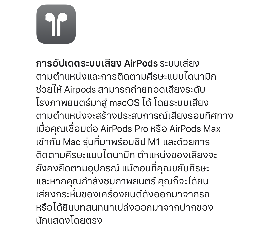 Apple ปล่อย macOS Monterey ให้ผู้ใช้ Mac ได้อัปเดตพร้อมระบุว่ารองรับฟีเจอร์ Spatial Audio (ระบบเสียงตามตำแหน่ง) ใน Mac รุ่นชิป M1 ขึ้นไป เมื่อใช้ร่วมกับหูฟังที่รองรับอย่าง AirPods Pro, AirPods Max หรือ AirPods รุ่นที่ 3