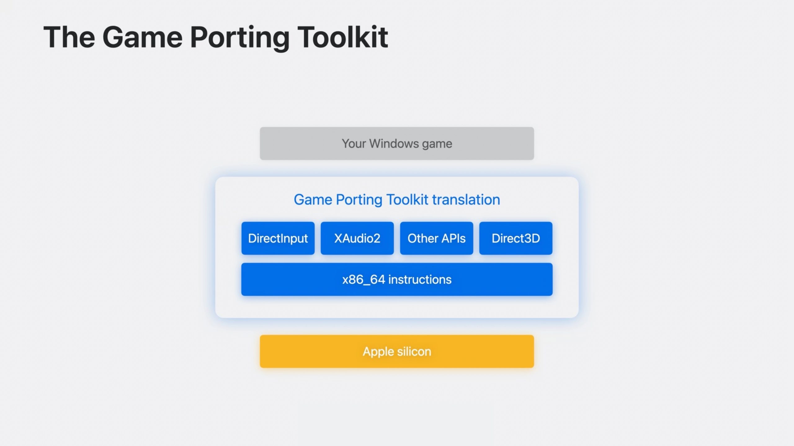 Game Porting Tool เป็นการพอร์ตเกมที่ง่ายมาก ๆ โดยที่นักพัฒนาไม่ต้องทำอะไรซับซ้อน ลดเวลาการทำงานให้สั้นลงได้ Apple ได้อิงวิธีจาก Wine ที่เป็นแพลตฟอร์ม Open Source สำหรับการแปลซอฟต์แวร์จาก Windows ให้เป็น Unix สำหรับ macOS
