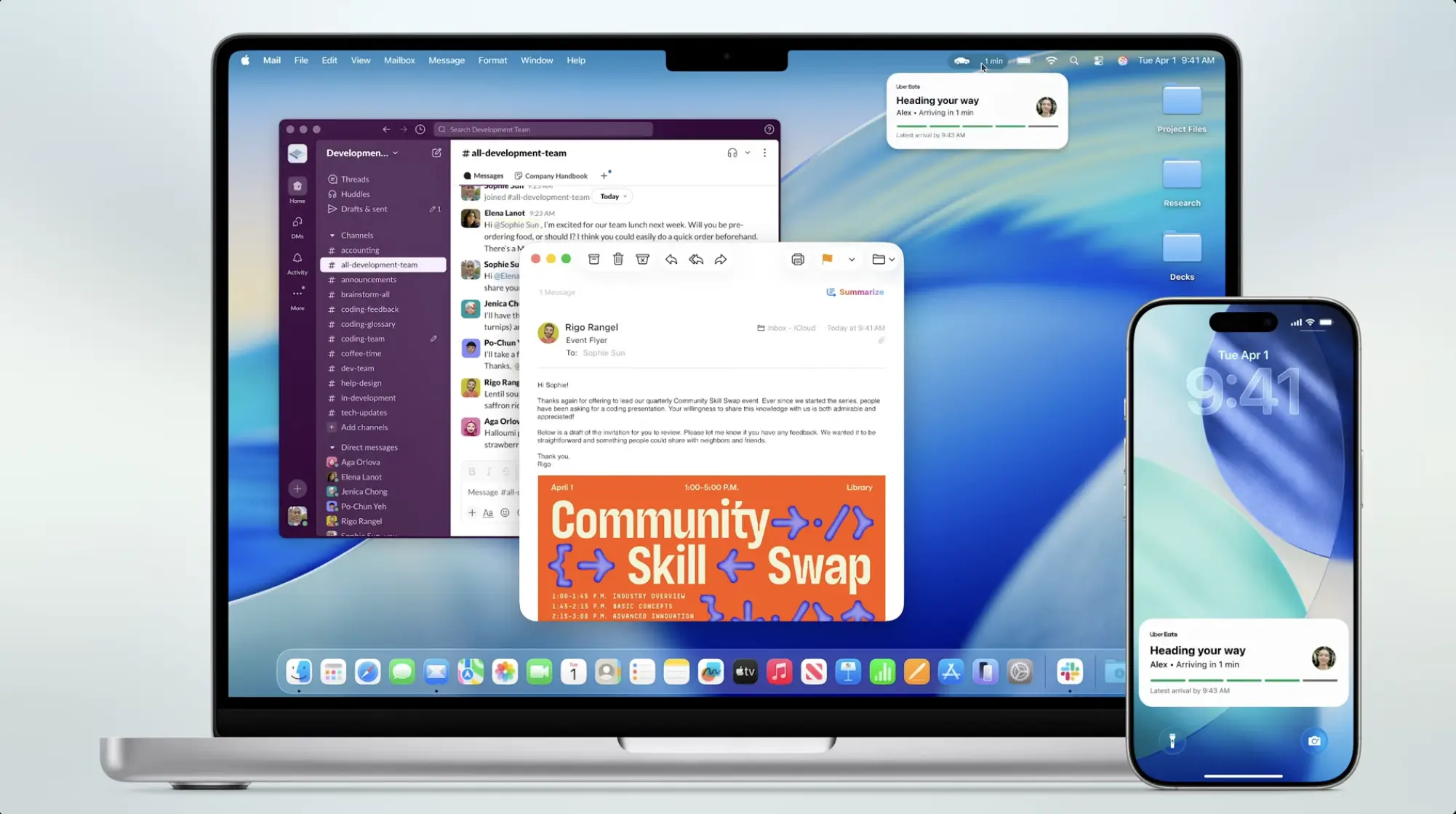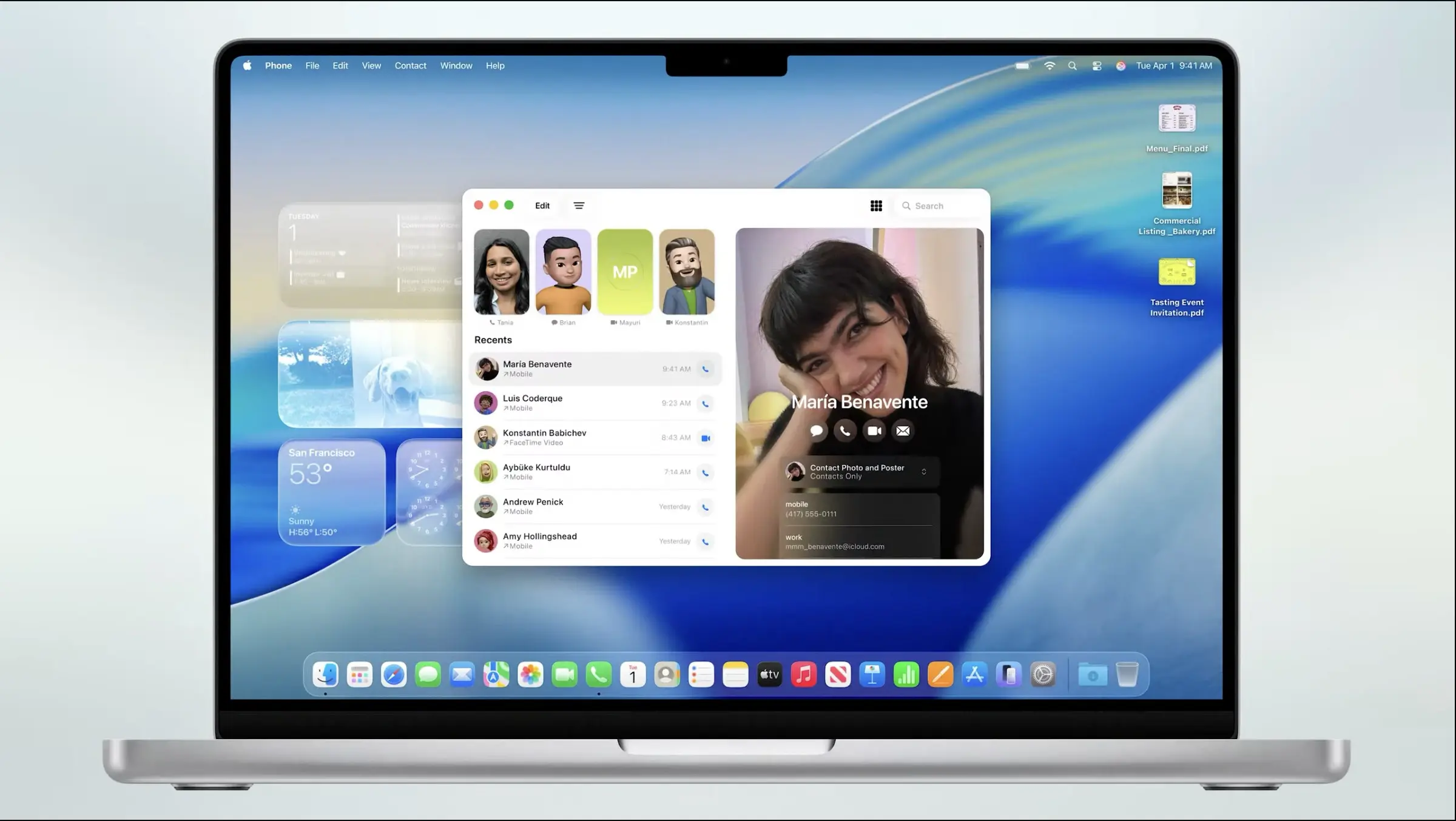 ซึ่งรวมถึงเดสก์ท็อป Dock ส่วนนำทางภายในแอป และแถบเครื่องมือ ผู้ใช้ยังสามารถปรับแต่งประสบการณ์การใช้งานให้ถูกใจมากยิ่งขึ้นด้วยศูนย์ควบคุมที่ได้รับการอัปเดตมาใหม่และตัวเลือกสีสำหรับโฟลเดอร์ ไอคอนแอป และวิดเจ็ต และเมื่อแอปโทรศัพท์มาอยู่บน Mac คุณสมบัติความต่อเนื่องก็ยอดเยี่ยมยิ่งขึ้นอีก ผู้ใช้จึงสามารถใช้งานคุณสมบัติที่คุ้นเคยจาก iPhone อย่างการโทรล่าสุด รายชื่อ และวอยซ์เมล รวมถึงคุณสมบัติใหม่อย่าง Call Screening และ Hold Assist ด้วย