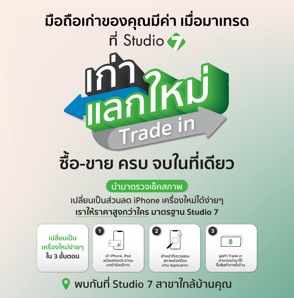 มือถือมีค่า เมื่อเทรดที่ Studio 7 พิเศษเปลี่ยนเครื่องเก่าคุณเป็น iPhone เราให้เพิ่มสูงสุด 1,500.-* จากราคาประเมิน (1 – 15 มิ.ย. 65) พบกันที่ Studio 7 สาขาใกล้บ้าน