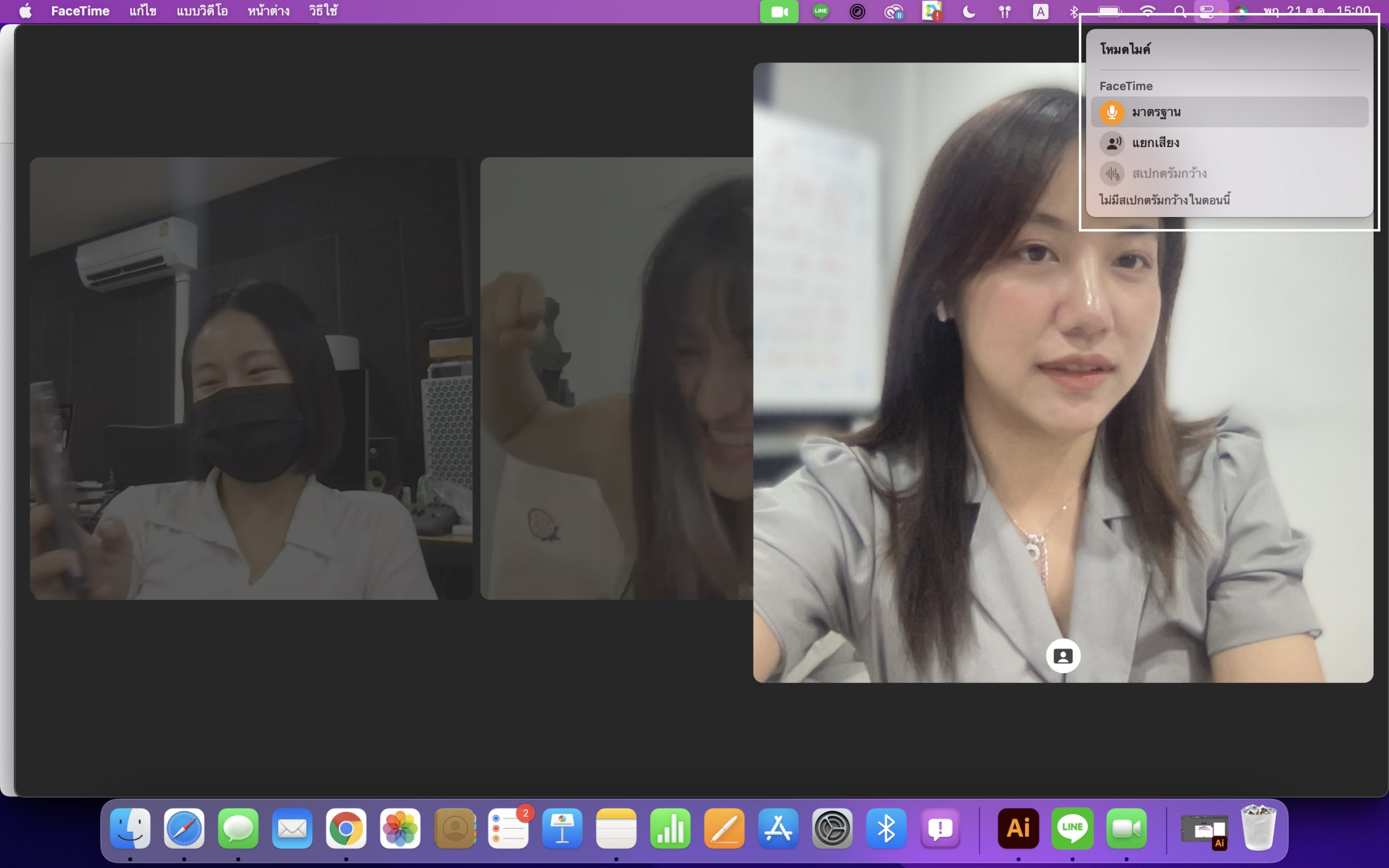 - สามารถเลือกโหมดไมค์ได้ : Voice Isolation (แยกเสียง) โหมดนี้จะตัดเสียงรบกวนรอบข้าง ทำให้เสียงผู้พูดชัดเจนมากขึ้น ส่วน Wide Spectrum (สเปกตรัมกว้าง) จะเก็บทุกเสียงในบริเวณนั้นให้ผู้เข้าร่วมได้ยิน