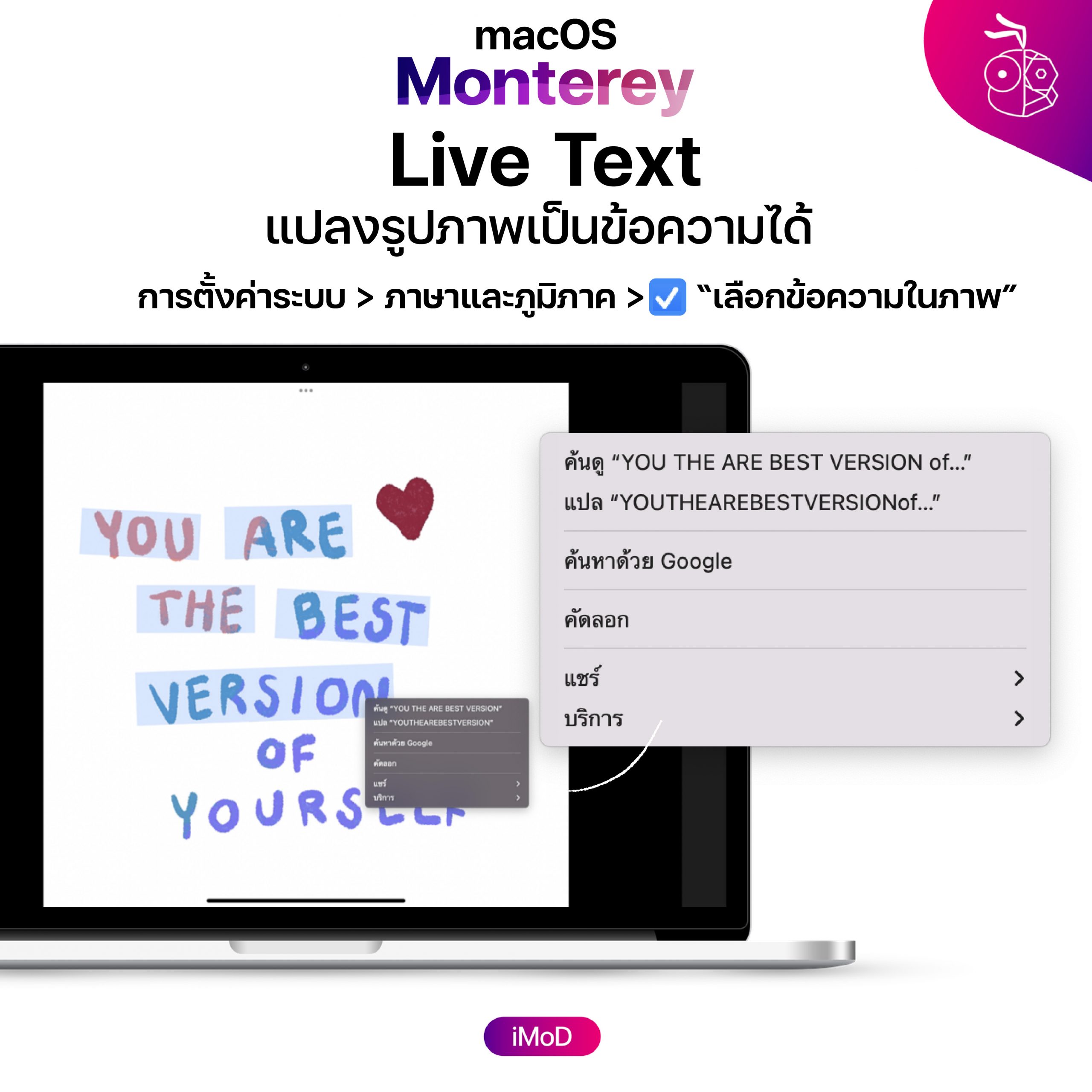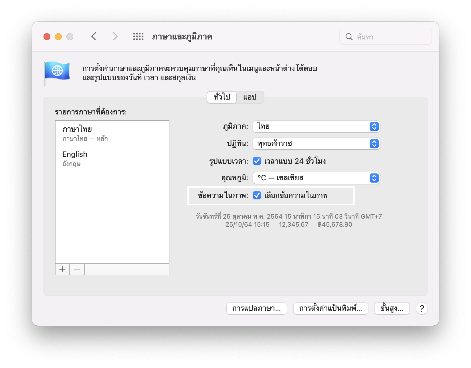 การตั้งค่าระบบ > ภาษาและภูมิภาค > “เลือกข้อความในภาพ”