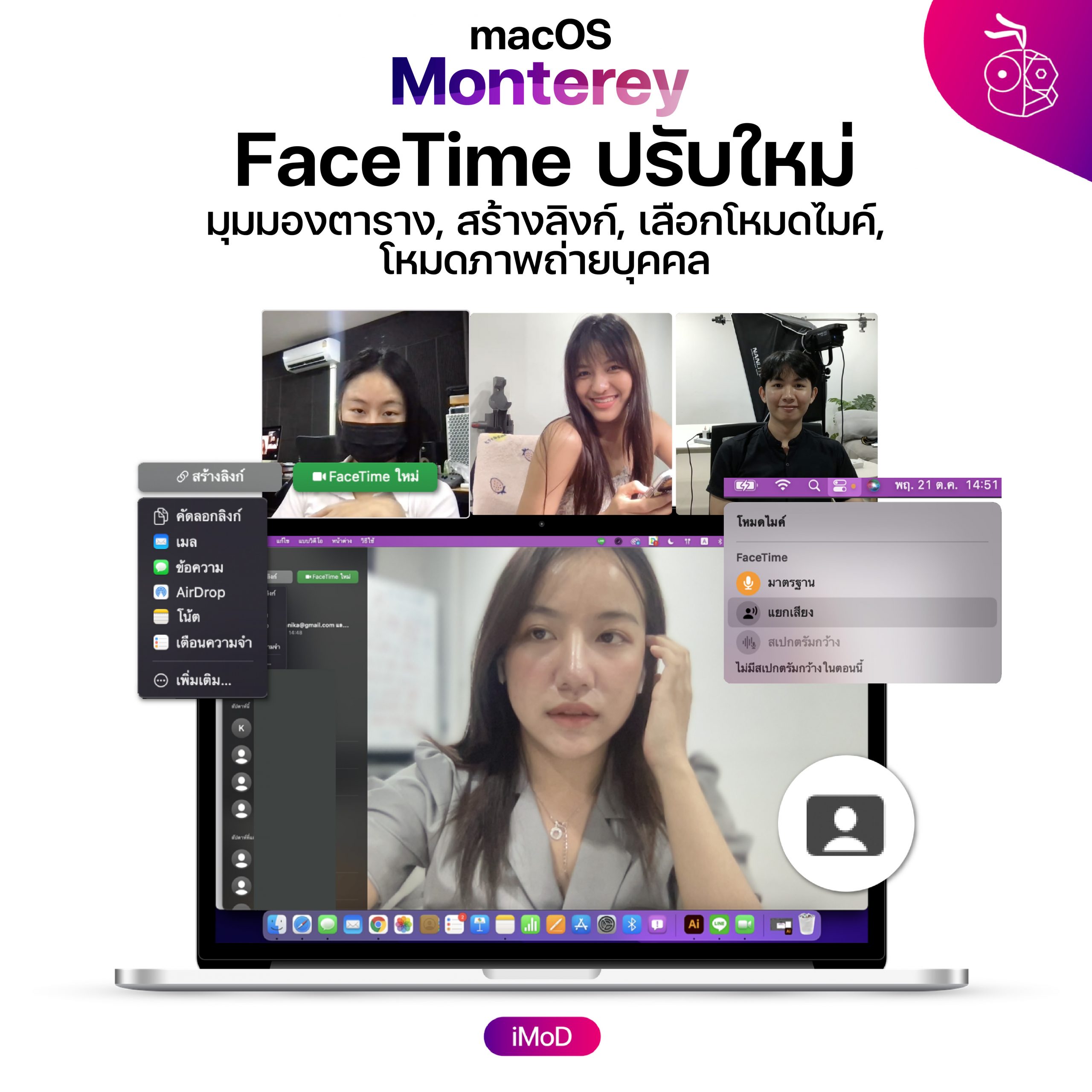 - โหมดภาพถ่ายบุคคล : คุยวิดีโอคอลด้วยภาพแบบหน้าชัดหลังเบลอ (ใช้ได้กับ Apple Neural Engine ในชิป M1 ขึ้นไป)