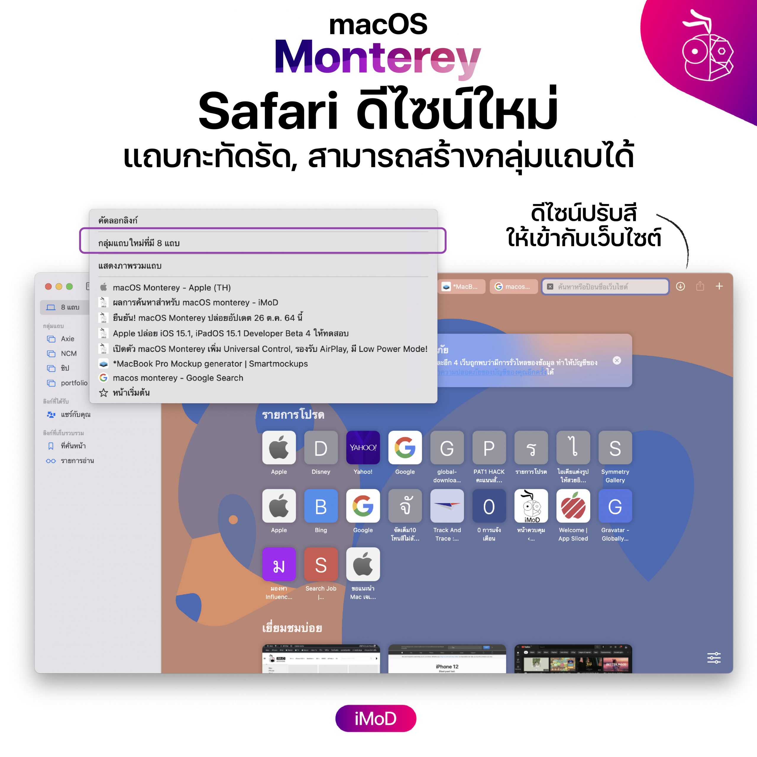เว็บเพจไปจน สุดขอบ หน้าต่าง ปรับสีให้เข้ากับเว็บไซต์ที่เราดูอยู่ และแถบเว็บไซต์ที่กะทัดรัดมากขึ้น - กลุ่มแถบ : สามารถสร้างกลุ่มแถบเพื่อจัดหมวดหมู่ของเว็ปไซต์ได้