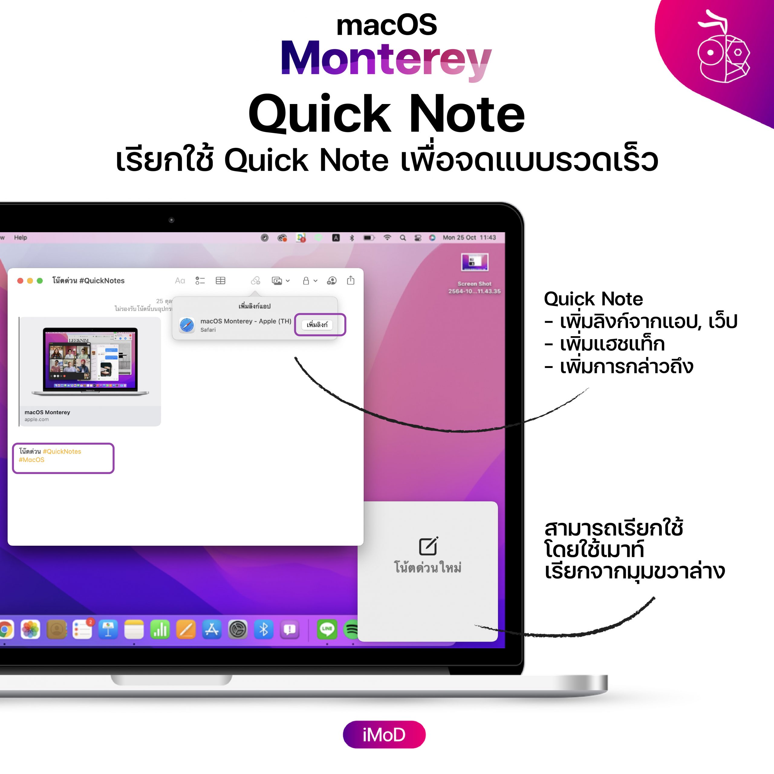 - สามารถเรียก Quick Note จากมุมขวาล่างของจอ Mac หรือกด Command+Q ซึ่งสามารถเรียกใช้ได้ตลอด ไม่ว่าจะเปิดแอปหรือหน้าเว็ปไซต์ไหนอยู่