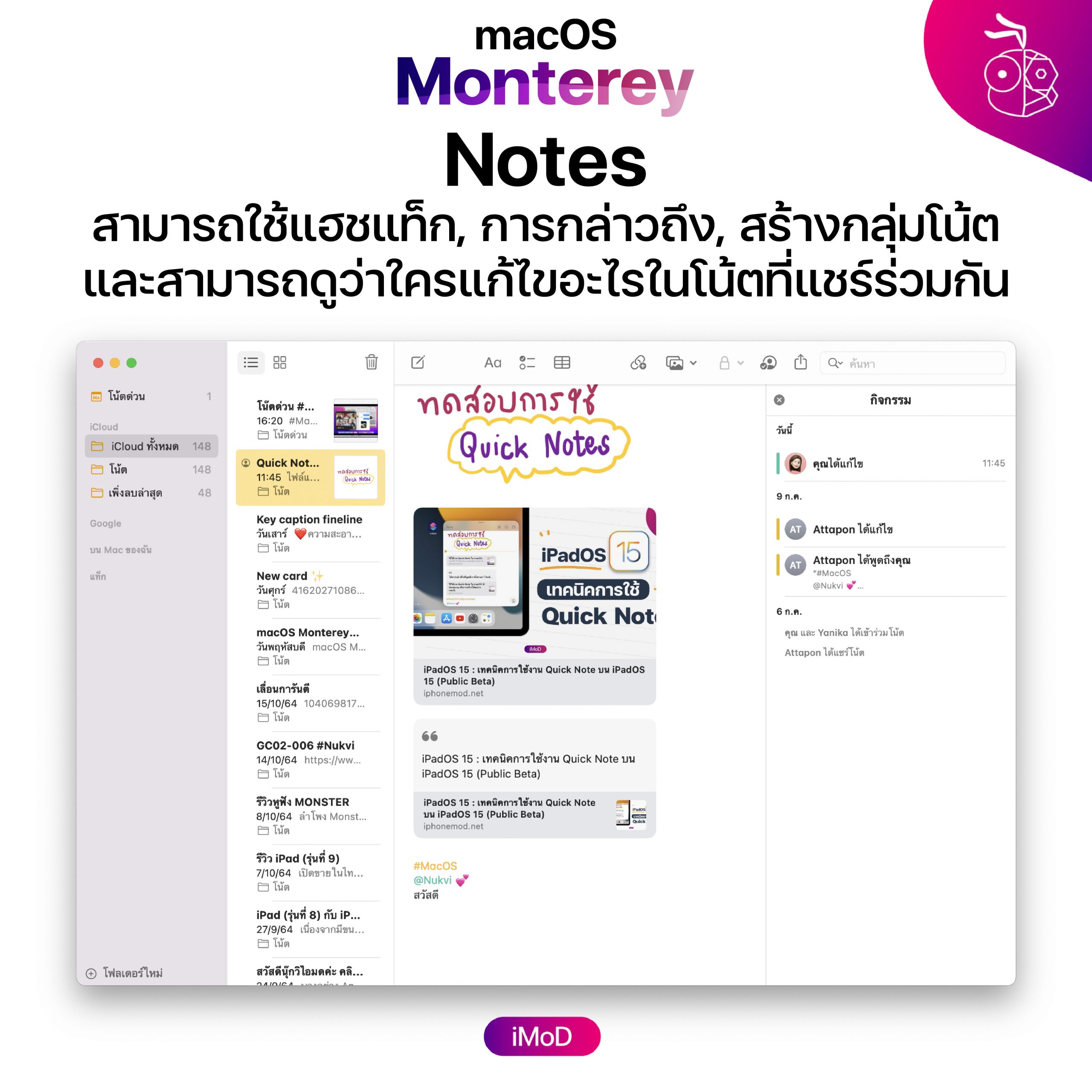 - Quick Note สามารถเพิ่มลิงก์จากแอป หรือ เว็ปไซต์ได้ และสามารถเพิ่มแฮชแท็ก และ เพิ่มการกล่าวถึงได้ด้วย