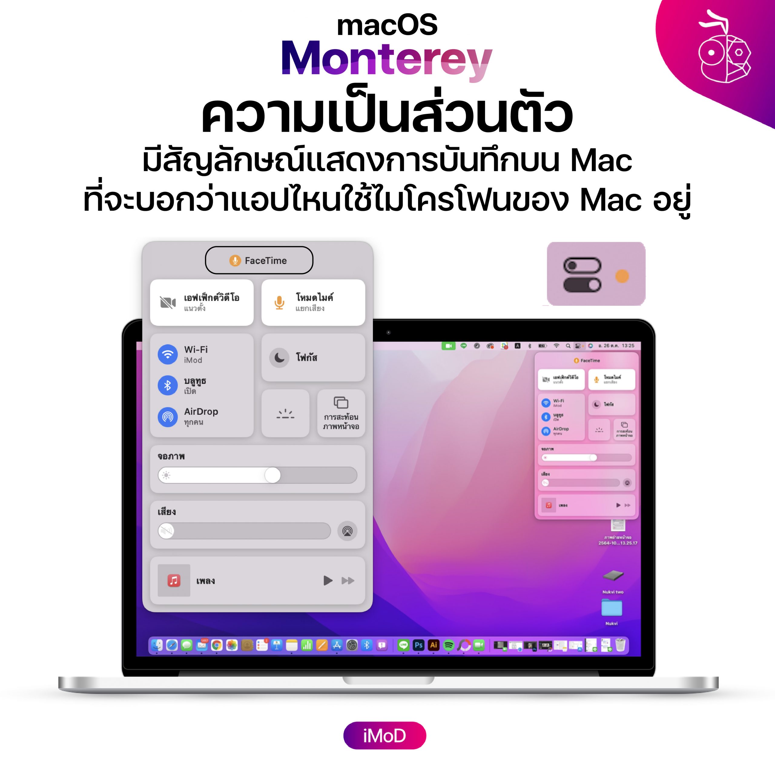 - มีสัญลักษณ์แสดงการบันทึกบน Mac ที่จะบอกว่าแอปไหนใช้ไมโครโฟนของ Mac อยู่