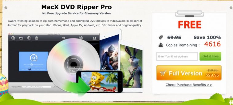 MacX DVD Ripper Pro ราคาปกติอยู่ที่ $59.95 หรือประมาณ 2038 บาท ตอนนี้แจกฟรีจำนวน 5,000 รางวัลใครโหลดก่อนก็ได้ก่อนนะครับ สนใจก็ไปดาวน์โหลดและขอโค้ดได้ฟรีที่ https://www.macxdvd.com/mac-dvd-video-converter-how-to/rip-a-dvd-with-free-dvd-decrypter.htm อย่าช้า ไม่งั้นหมดก่อนก็อดนะครับ 🙂