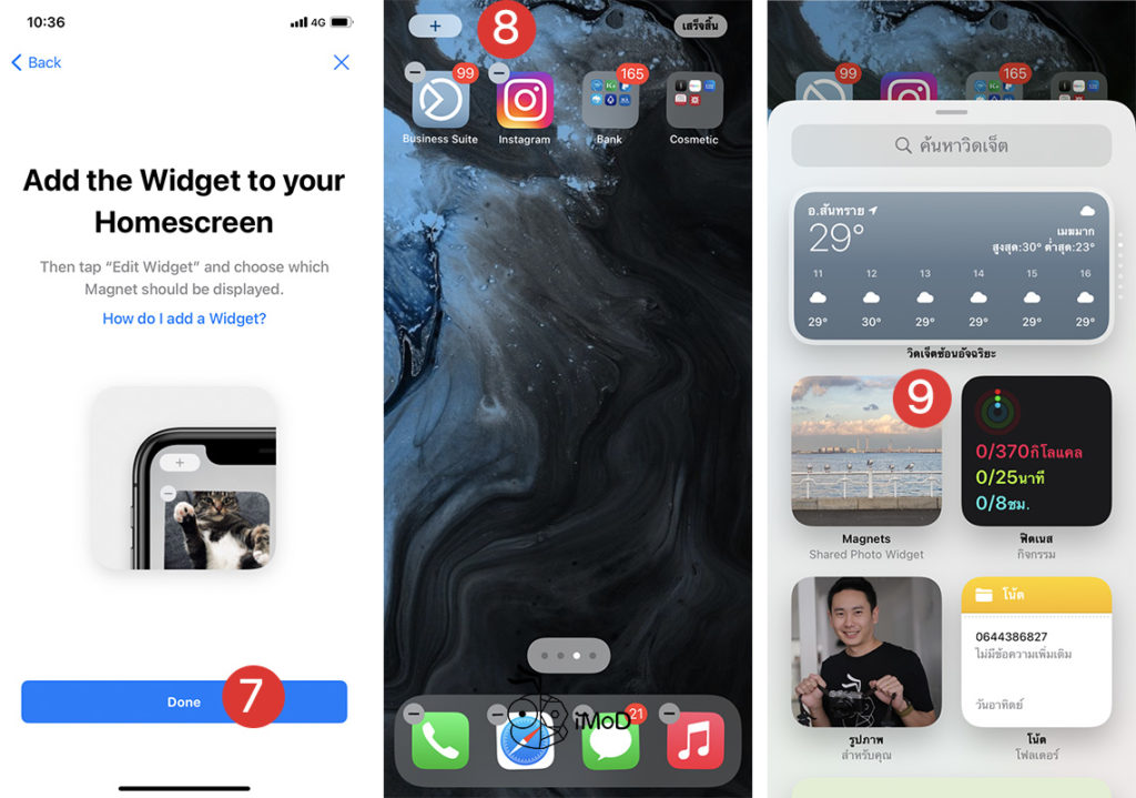 แตะ Done จากนั้นเราก็มาตั้งค่าวิดเจ็ตบนหน้าโฮม iPhone ของเราได้เลย โดยแตะค้างหน้าโฮม แล้วแตะไอคอน + ด้านบนซ้าย > เลือกวิดเจ็ต Magnets วิดเจ็ตนั้นก็จะแสดงบนหน้าโฮม