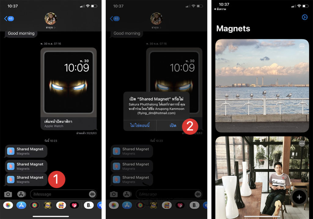 ในฝั่งของผู้รับแชร์ก็จะได้รับข้อความ ให้แตะ Shared Magnet > แตะ เปิด > ฝั่งผู้รับก็จะเห็นภาพที่เพื่อนแชร์มาให้ในแอป Magnets