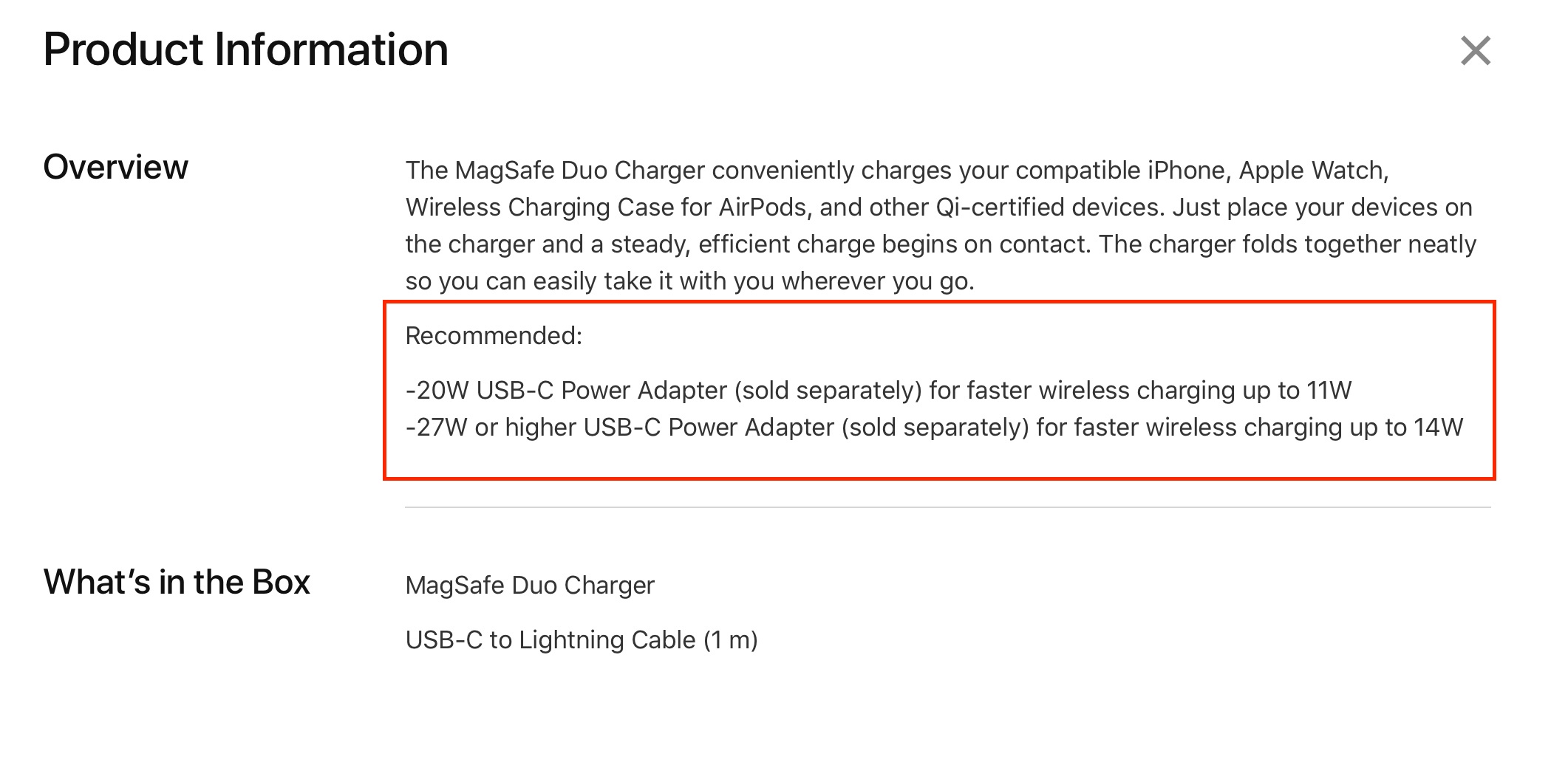 Apple ได้อัปเดตข้อมูลของที่ชาร์จ MagSafe แบบคู่ ในหน้าข้อมูลสินค้าว่าที่ชาร์จ MagSafe แบบคู่อาจจะชาร์จไฟได้ไม่เต็ม 15 วัตต์ ขณะที่ที่ชาร์จ MagSafe แบบธรรมดา สามารถทำได้
