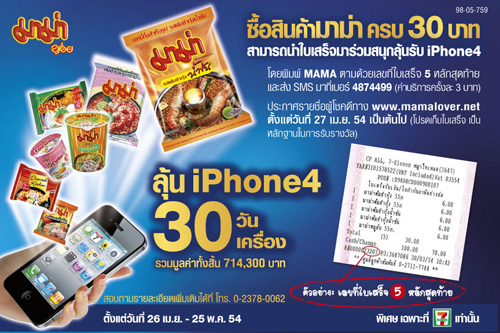 มาม่าลุ้นโชค IPhone4 30 วัน 30 เครื่อง ซื้อสินค้ามาม่า ครบ 30 บาท สามารถนำใบเสร็จมาร่วมสนุกลุ้นรับ IPhone4 โดยพิมพ์ MAMA ตามด้วยเลขที่ใบเสร็จ 5 หลักสุดท้าย และส่ง SMS มาที่ เบอร์ 4874499 (ค่าบริการครั้งละ 3 บาท)