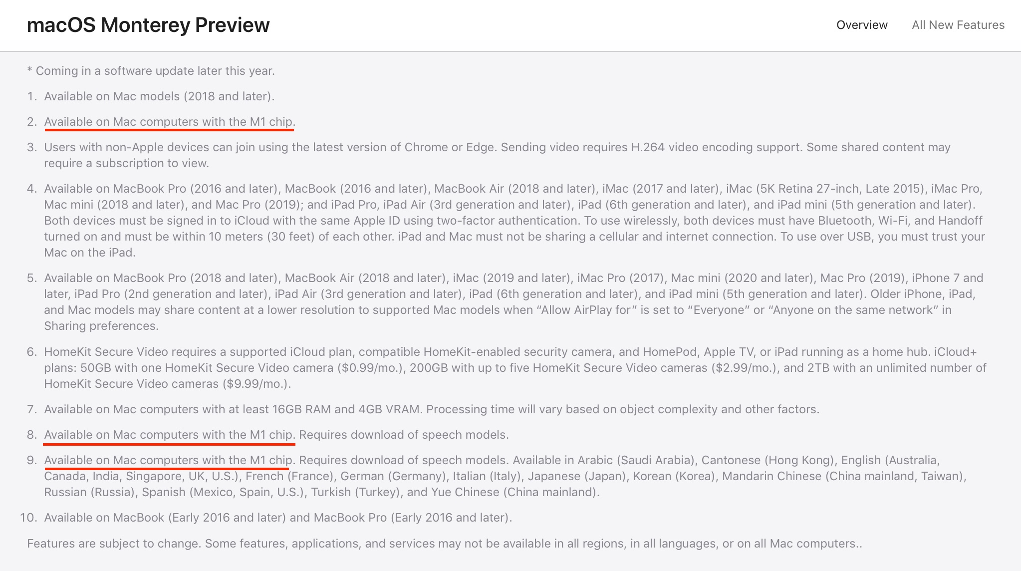 ในหน้าพรีวิวคุณสมบัติของ macOS Monterey ระบุว่าหลาย ๆ ฟีเจอร์จะใช้งานได้บน Mac รุ่นชิป M1 อย่าง MacBook Air, MacBook Pro 13 นิ้ว, Mac mini รวมถึง iMac