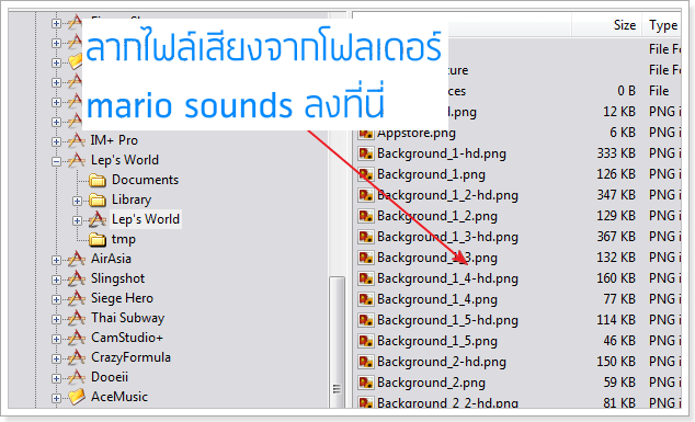 ขั้นที่ 4 ก๊อบไฟล์ทั้งหมดในโฟลเดอร์ mario sounds ไปทับที่ (พาร์ทของแอป Lep’s World)