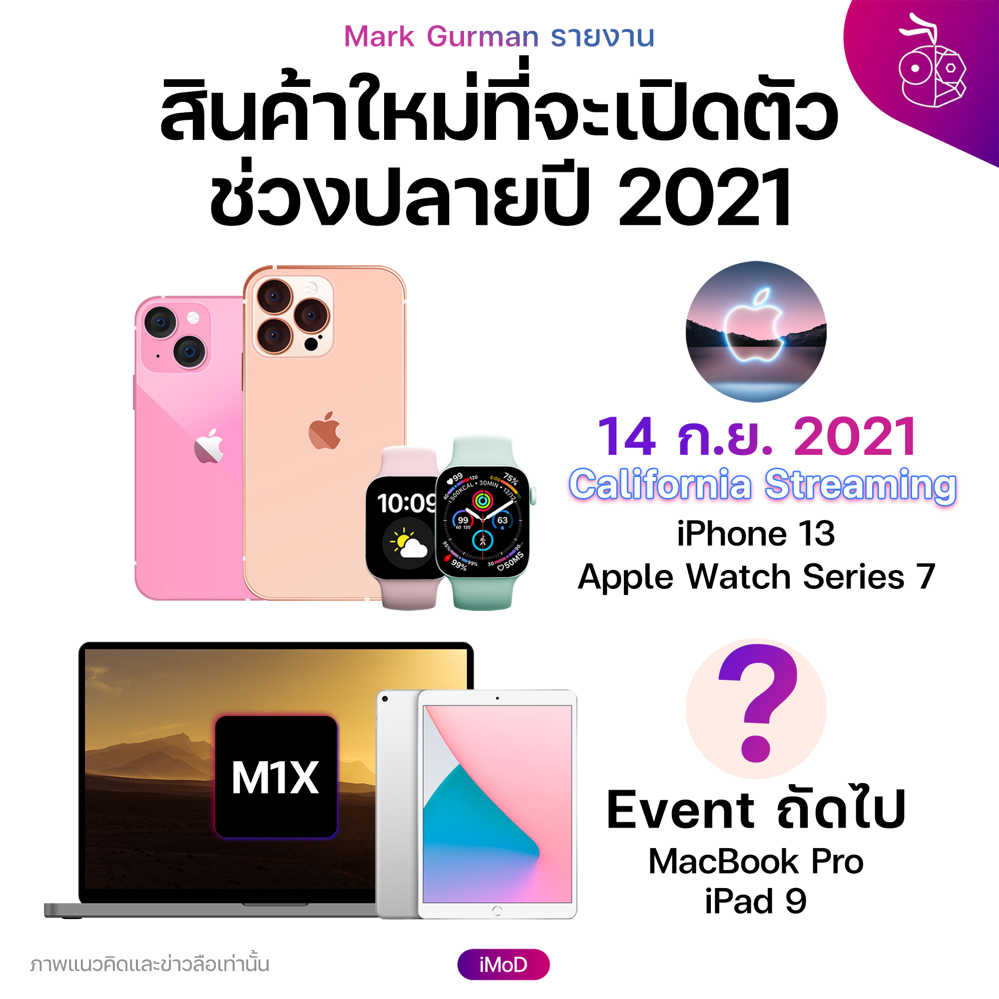 Mark Gurman เผยข้อมูลให้ชัดขึ้นว่า งาน Apple Event ที่จะจัดขึ้นในคืนพรุ่งนี้ (14 ก.ย.) จะมี iPhone 13, Apple Watch Series 7 เปิดตัว ส่วน MacBook, iPad รุ่นใหม่ จะเปิดตัวในอีกงาน