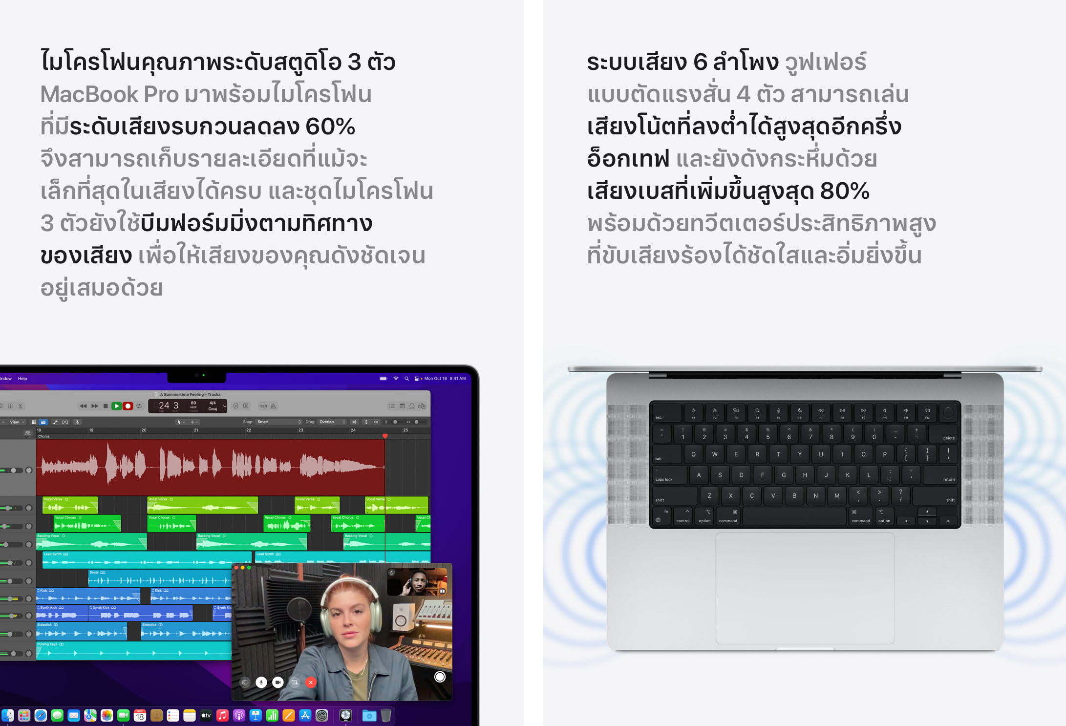 MacBook Pro 2021 ใช้ไมโครโฟนคุณภาพระดับสตูดิโอ 3 ตัว มีระดับเสียงรบกวนลดลง 60%, ชุดไมโครโฟน 3 ตัวยังใช้บีมฟอร์มมิ่งตามทิศทางของเสียง