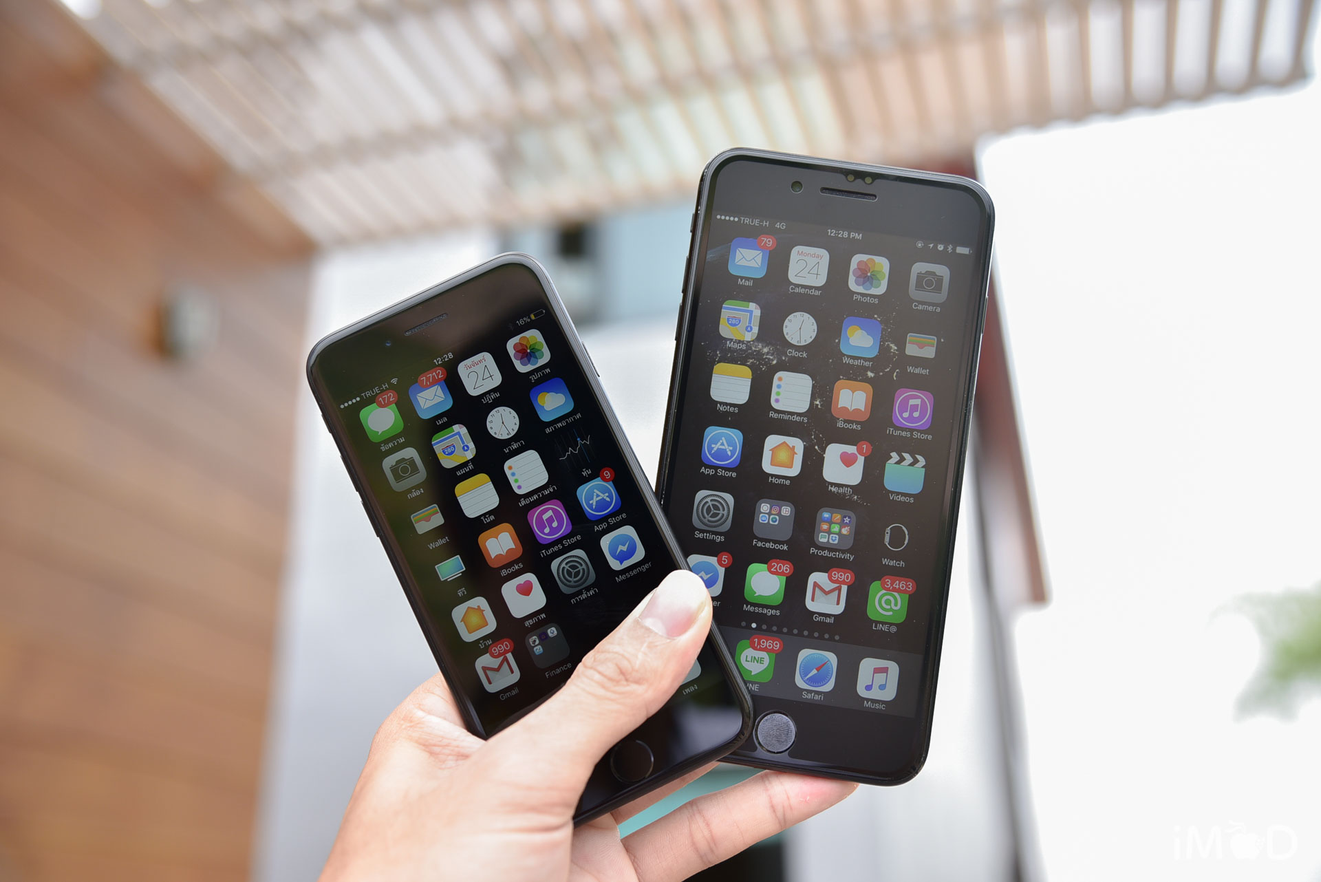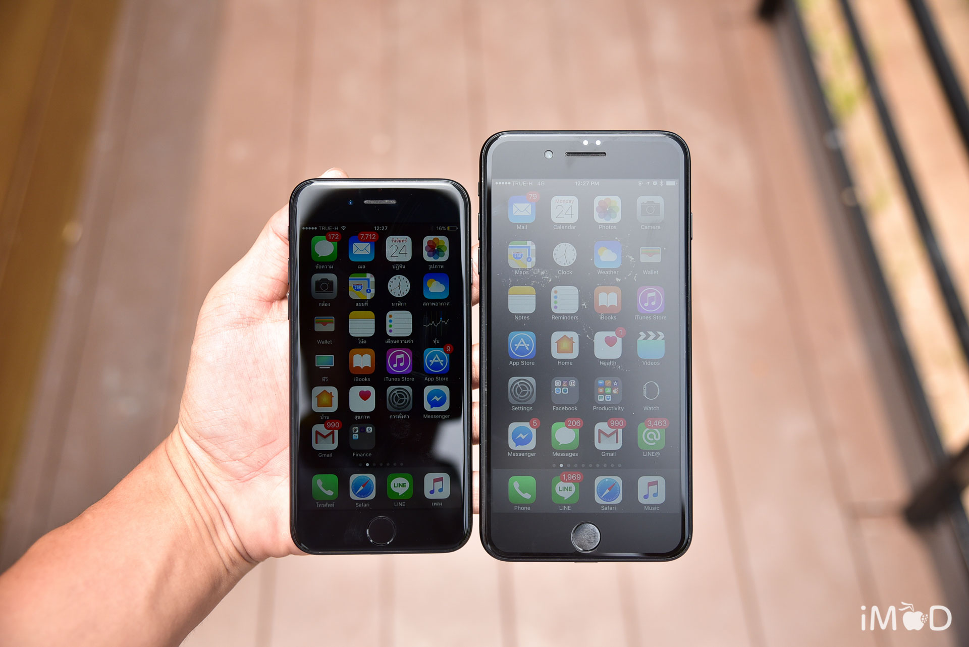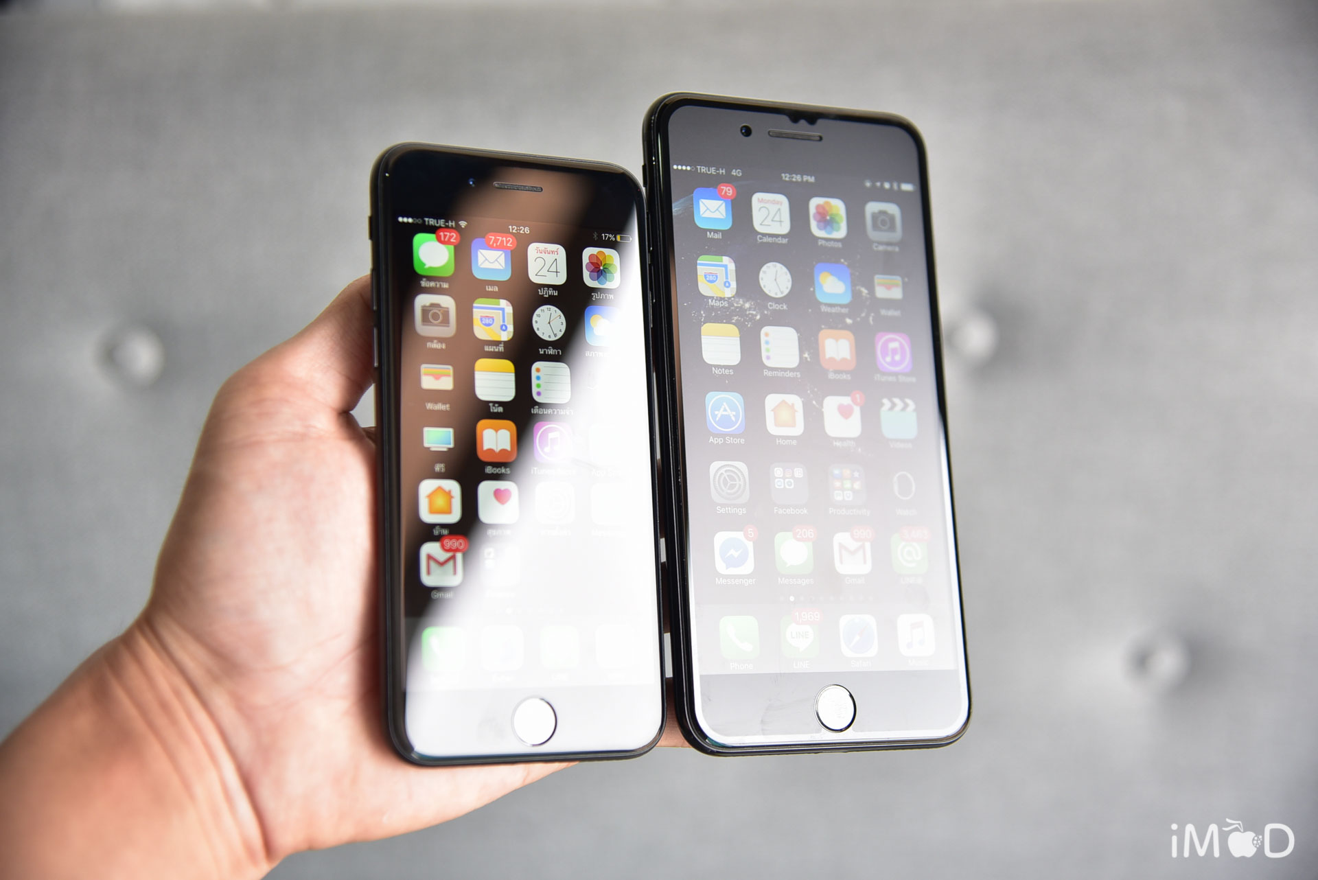 ด้านซ้าย iPhone 7 ยังไม่ได้ติดกระจกกันรอยใดๆ ส่วนด้านขวาคือ iPhone 7 Plus ติดกระจกกันรอยแบบด้านแล้ว เทียบให้ดูเรื่องการลดการสะท้อนแสง แน่นอนว่า กระจกกันรอยแบบด้านทำได้ดีกว่า