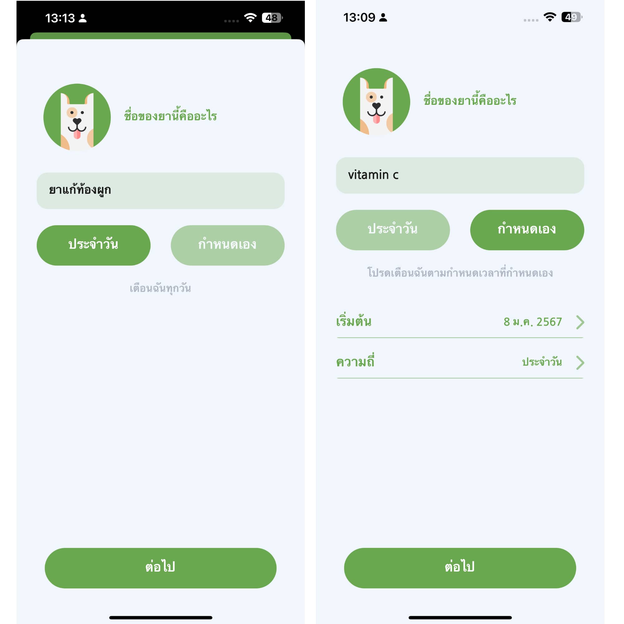 จากนั้นใส่ชื่อยาได้เลย แล้วเลือกได้เลยว่าจะให้เตือนประจำวัน หรือแบบกำหนดเอง