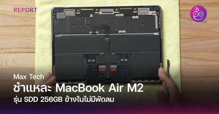 Max Tech ชำแหละ MacBook Air ชิป M2 รุ่น SDD 256GB ข้างในไม่มีพัดลม ใช้ SSD 256GB แบบตัวเดียว ภายโนโดยรวมเหมือน MacBook Air รุ่นก่อนหน้า แต่แบตเตอรี่ใหญ่ขึ้น