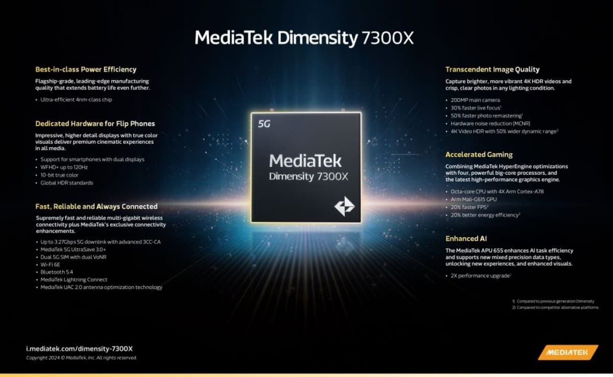 Yenchi Lee รองผู้จัดการทั่วไปส่วนธุรกิจการสื่อสารไร้สายของ MediaTek กล่าวว่า “MediaTek Dimensity 7300 เป็นส่วนสำคัญในการผสานนวัตกรรมที่โดดเด่นด้วยขุมพลัง AI กับฟีเจอร์ต่าง ๆ ในการสื่อสาร ทำให้สามารถสตรีมและเล่นเกมได้อย่างลื่นไหล นอกจากนี้ Dimensity 7300X ผู้ผลิต OEM สามารถพัฒนานวัตกรรมลูกเล่นใหม่ได้ด้วยการรับการแสดงผลแบบจอคู่”