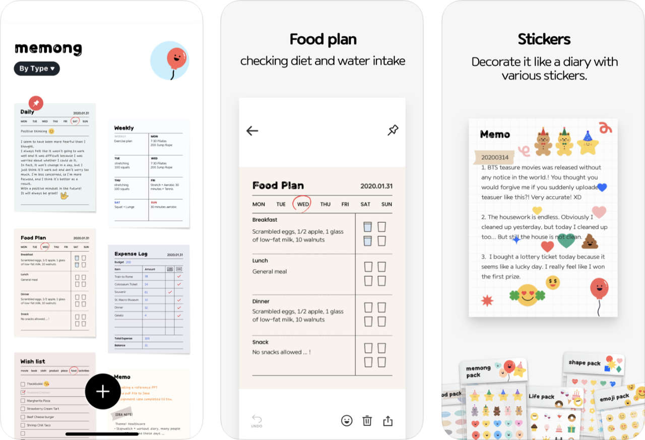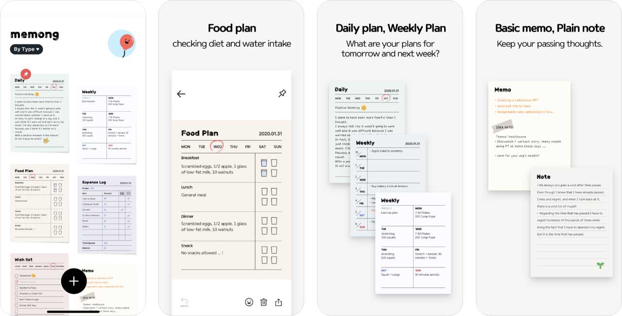 แอป Memong นั้นสามารถประยุกต์ให้คุณลิสต์รายการได้หลากหลาย เช่น วางแผนการทำงานรายวัน, แผนรายสัปดาห์, รายการซื้อของ, บันทึกค่าใช้จ่าย, แผนอาหารลดน้ำหนัก หรือแผนการออกกำลังกาย เป็นต้น