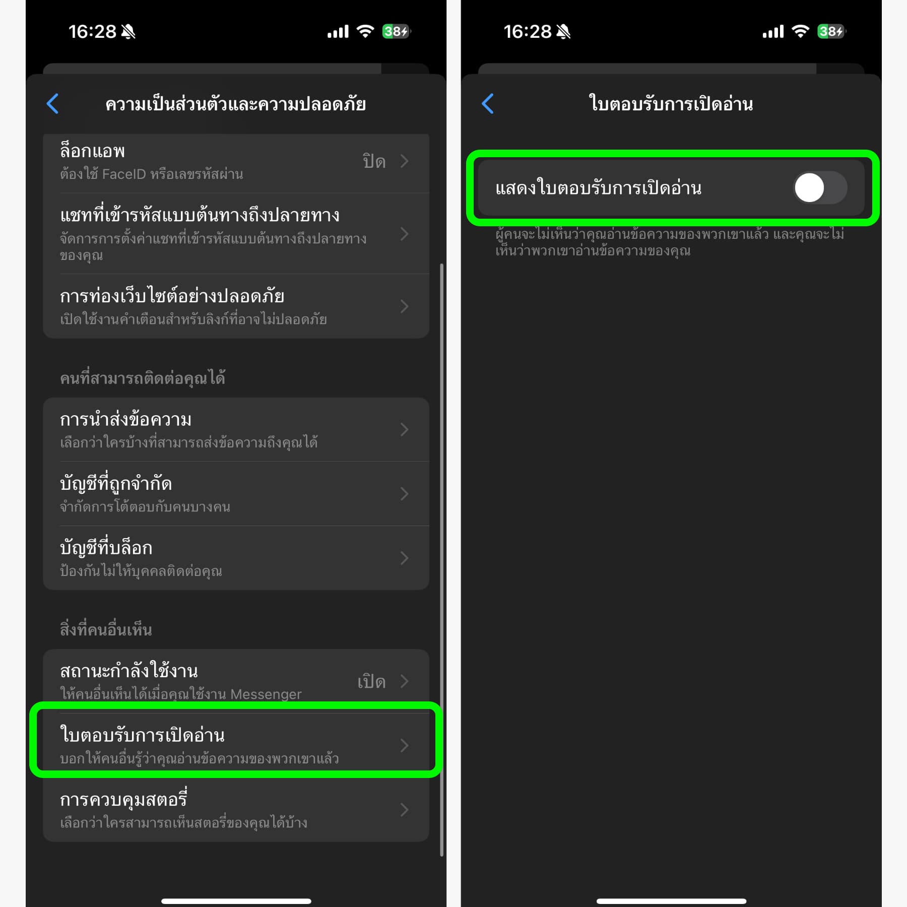 💡หากปิดใช้งานแล้ว คุณก็จะไม่เห็นว่าเพื่อนอ่านข้อความของคุณด้วย