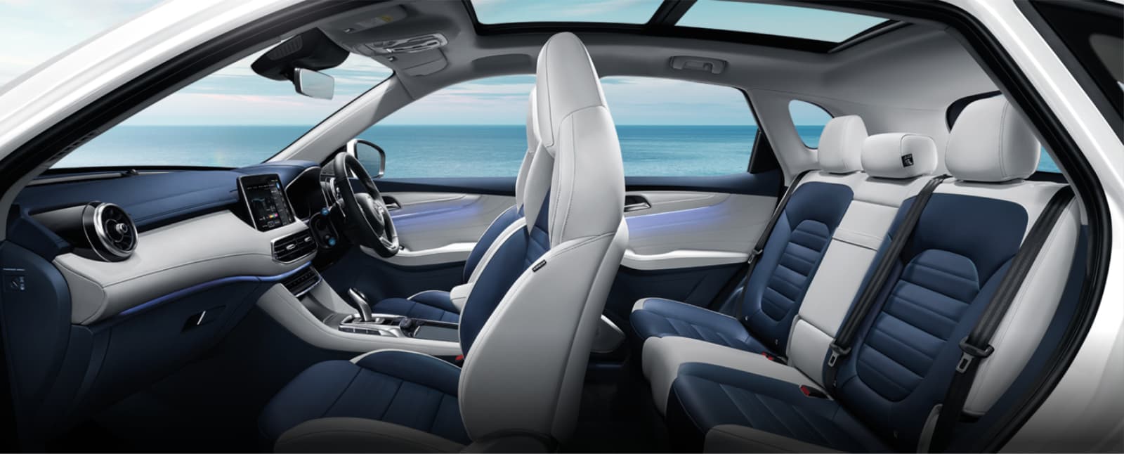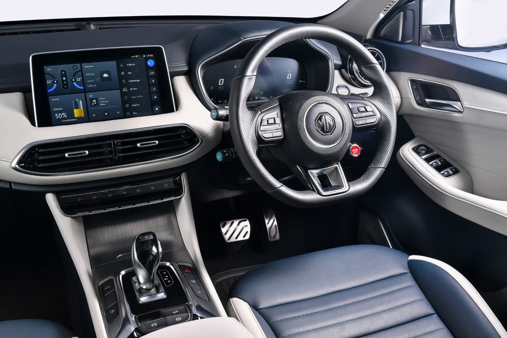 ภายในห้องโดยสารของ NEW MG HS และ NEW MG HS PHEV ตกแต่งด้วยสี 2-Tone Monaco Blue ใช้วัสดุบุนุ่มแบบ Soft Touch ให้ความรู้สึกหรูหราและพรีเมี่ยมในทุกรายละเอียด พร้อมฟังก์ชั่นที่ให้ทั้ง ความสะดวกสบายและคุณค่าระหว่างการขับขี่ที่ครบครัน