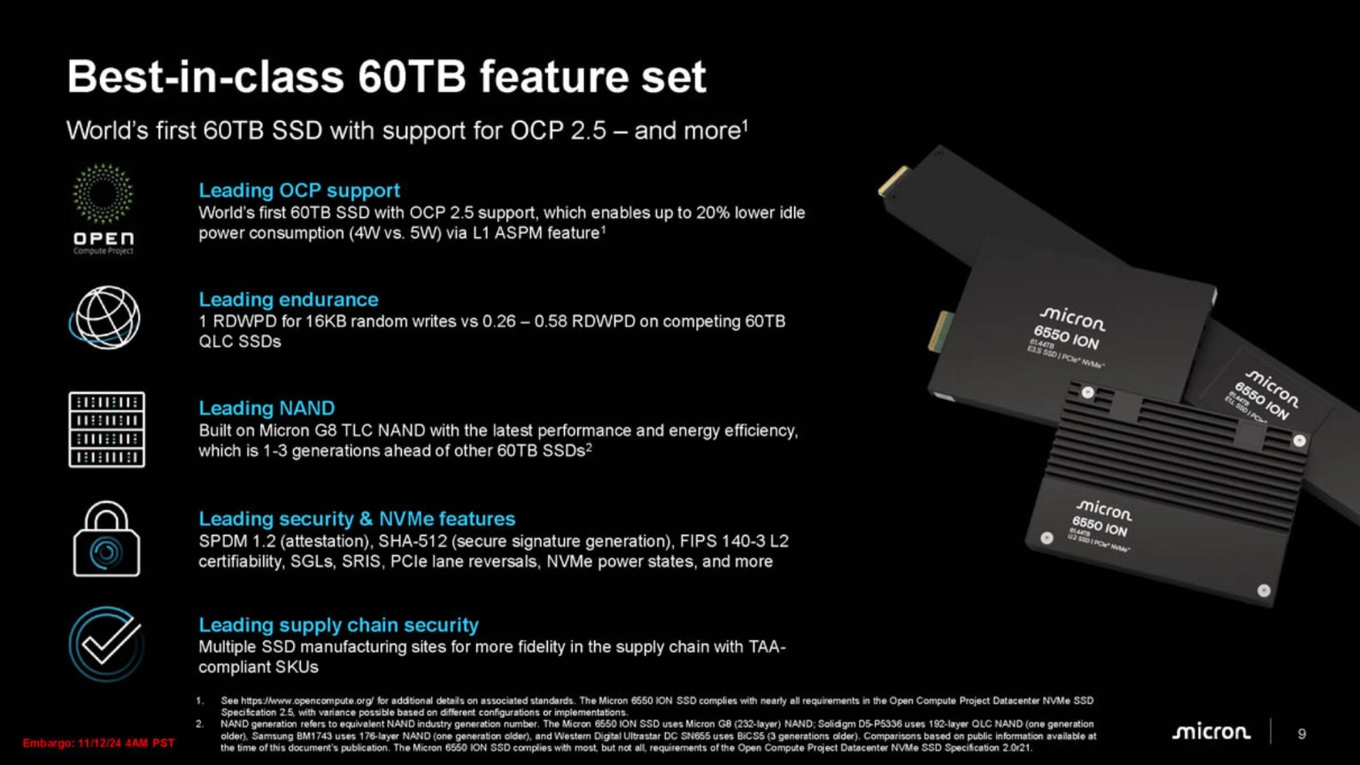Micron 6550 ION เป็น SSD สำหรับศูนย์ข้อมูลที่เร็วที่สุดในโลกขนาด 60TB และเป็น SSD แบบ E3.S และ PCIe Gen5 โดยเป็นการสืบต่อความสำเร็จของรุ่น 6500 ION ที่ได้รับรางวัล และออกแบบมาเพื่อมอบประสิทธิภาพ พลังงาน ทนทาน ความปลอดภัย และความหนาแน่นของชั้นวางที่ดีที่สุดในระดับเดียวกันสำหรับการใช้งานในศูนย์ข้อมูล exascale