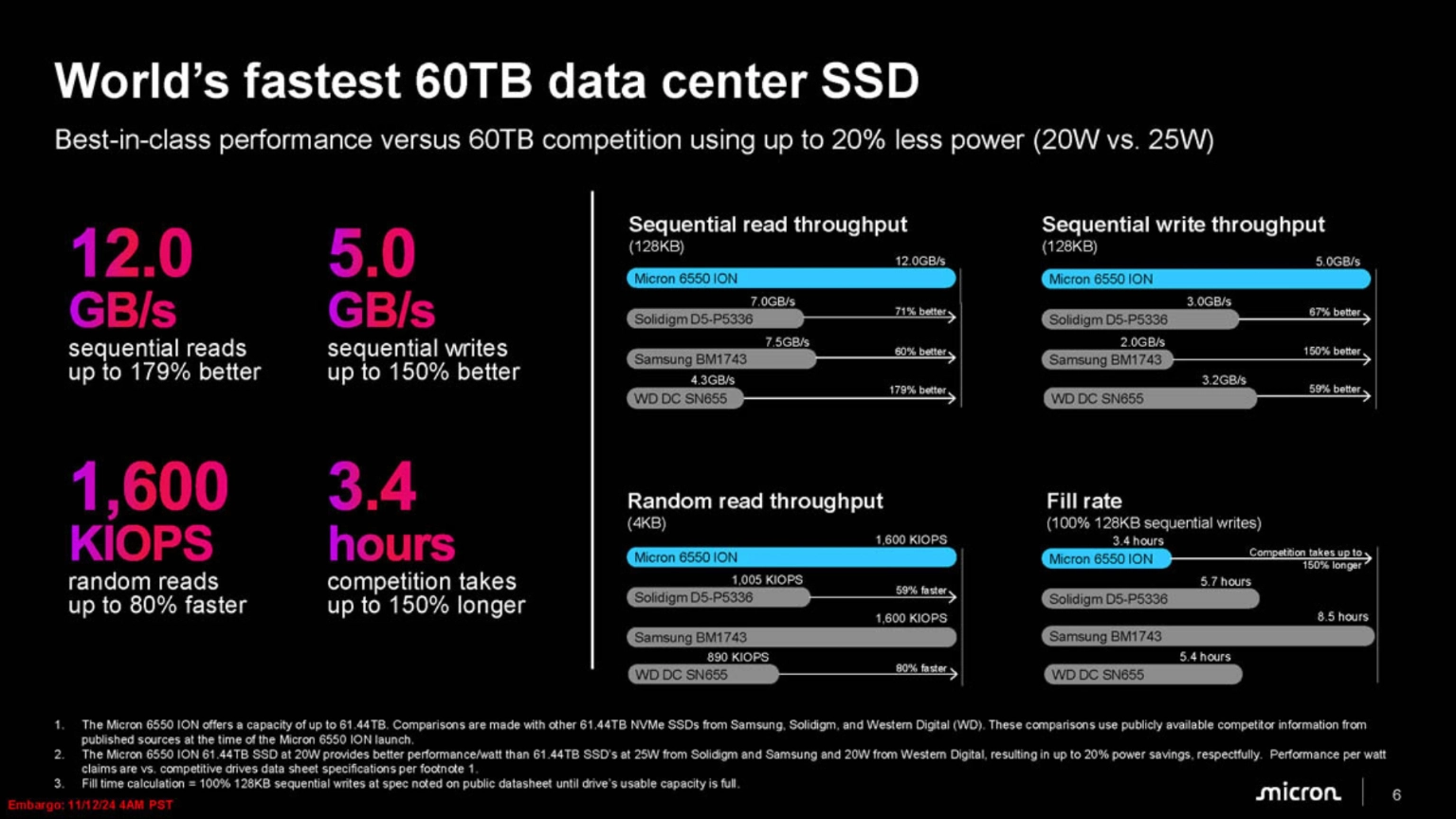 ในการทดสอบ Micron 6550 ION มีอัตราการอ่านแบบ sequential สูงถึง 12,000 MB/s เขียนแบบ sequential ที่ 5,000 MB/s และอัตราการอ่านแบบสุ่ม 1,600 KIOPS ประสิทธิภาพสูงกว่า สำหรับ NVIDIA® Magnum IO™ GPUDirect® Storage (GDS) และประหยัดพลังงานดีกว่า