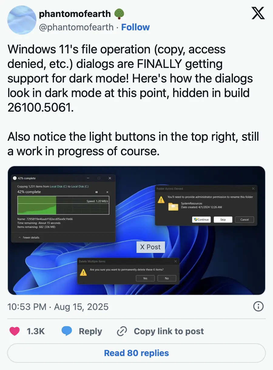 ผู้พัฒนา Windows – Phantomofearth ได้สังเกตเห็นโต้ตอบของการดำเนินการไฟล์ที่อัปเดตตามธีมมืด ถ้าคุณกำลังคัดลอกไฟล์หรือลบไฟล์ โต้ตอบเหล่านี้จะมีโหมดมืดในที่สุดแทนที่จะเป็นพร้อมท์ธีมสว่าง อย่างไรก็ตาม ยังอยู่ในกระบวนการปรับปรุง เนื่องจากปุ่มในพร้อมท์เหล่านี้ยังคงเป็นปุ่มสว่างแทนที่จะเป็นปุ่มมืด