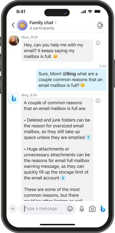 ส่วนของแอป Skype ที่เป็นแอปสื่อสารนั้น ก็ได้ขยายการขับเคลื่อนด้วยพลัง AI เช่นกัน เพื่อยกระดับการแชทให้มีประโยชน์สูงสุด โดยผู้ใช้สามารถใช้งาน Bing ในแอป Skype เพื่อขอข้อมูลหรือถามคำถามต่าง ๆ Bing ที่มี ChatGPT อยู่ในตัวก็จะตอบทุกคำถามอย่างชาญฉลาดและให้ข้อมูลกับทุกคนในกลุ่มแชท