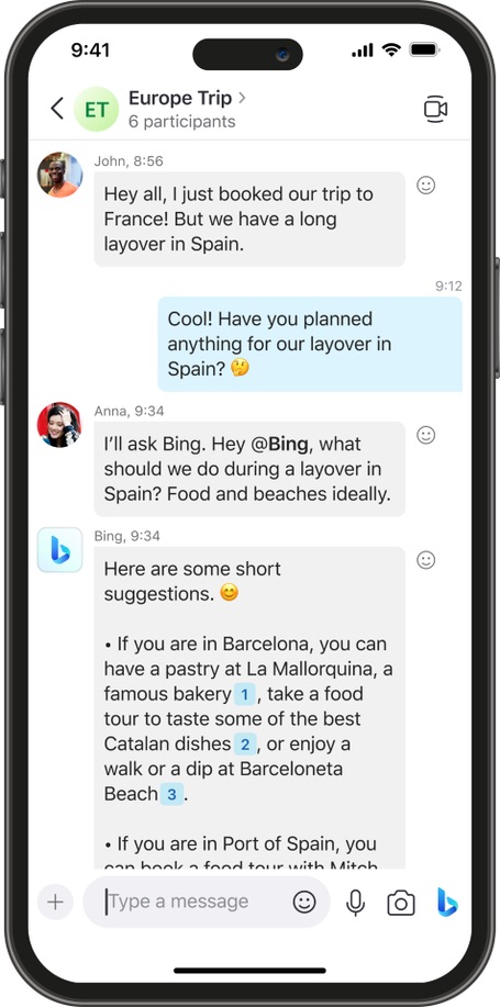 การที่เพิ่ม Bing เข้าไปในแอป Skype นี้ จะช่วยให้การพูดคุยในห้องแชทกลุ่มสนุกสนานและได้รับสาระดี ๆ มากขึ้น เช่น ห้องแชทภายในครอบครัว ที่กำลังพูดคุยกันเรื่องออกทริปไปเที่ยว ก็สามารถขอให้ Bing แนะนำเกี่ยวกับข้อมูลจุดหมายปลายทาง พยากรณ์อากาศ และกิจกรรมที่น่าสนใจได้
