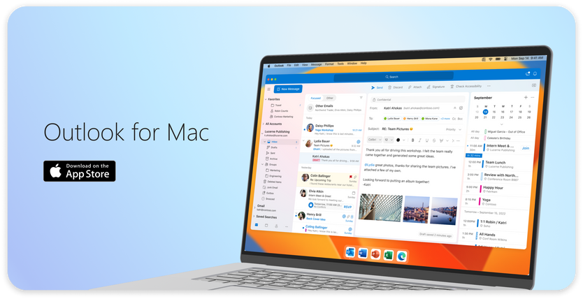 Outlook ช่วยให้เราจัดการอีเมล คัดแยกอีเมล อ่านจดหมายข่าว และดูกิจกรรมบนปฏิทินได้ผ่านวิดเจ็ตปฏิทินของ Outlook และดูการแจ้งเตือนต่าง ๆ ในแอปปฏิทินได้ผ่านการแจ้งเตือนบน Mac และสามารถกดดูแอปปฏิทินแบบรวดเร็วได้ผ่าน Menu bar peek รวมถึงสร้างกิจกรรมถัดไปในแอปปฏิทินได้เลยผ่านการกดตัวเลือกเพิ่มเติมในแบนเนอร์การแจ้งเตือน