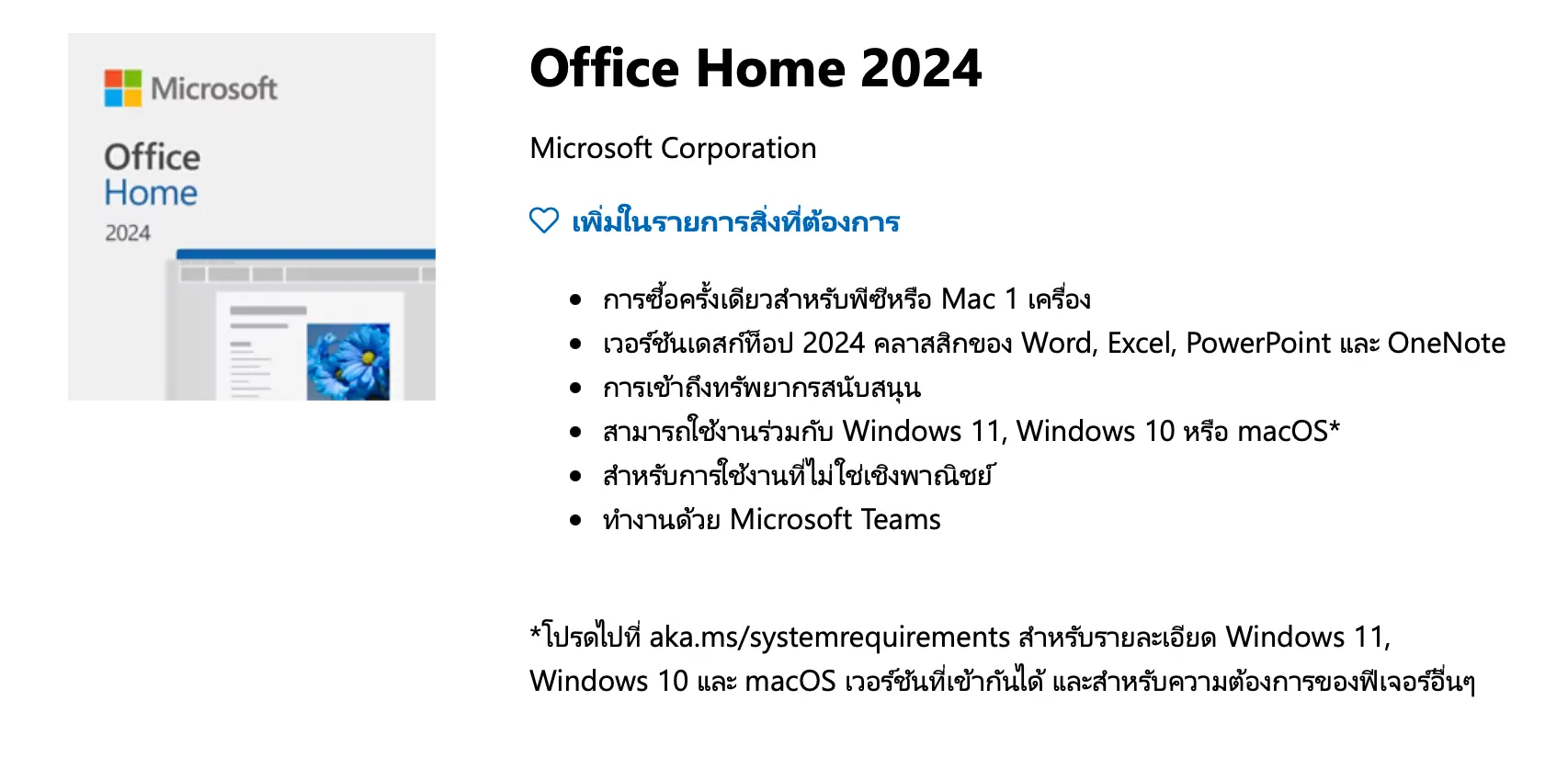 Office Home 2024 – สำหรับนักเรียนและครอบครัว ประกอบด้วย Word, Excel, PowerPoint และ OneNote เวอร์ชันคลาสสิก : ราคา 4,299 บาท (สั่งซื้อ)