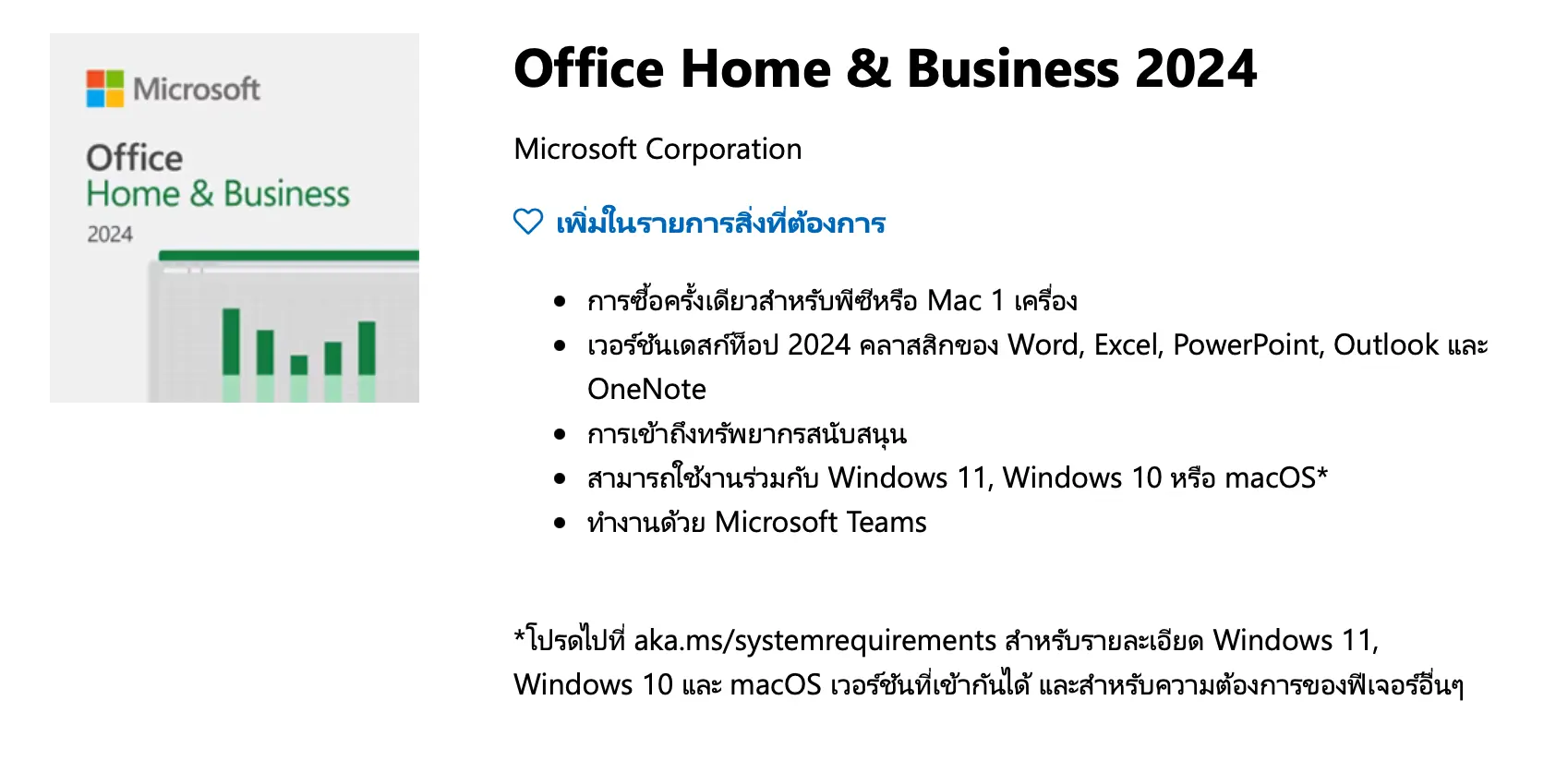 Office Home & Business 2024 – สำหรับครอบครัวและธุรกิจขนาดเล็ก ประกอบด้วย Word, Excel, PowerPoint, OneNote และ Outlook เวอร์ชันคลาสสิก : ราคา 10,999 บาท (สั่งซื้อ)