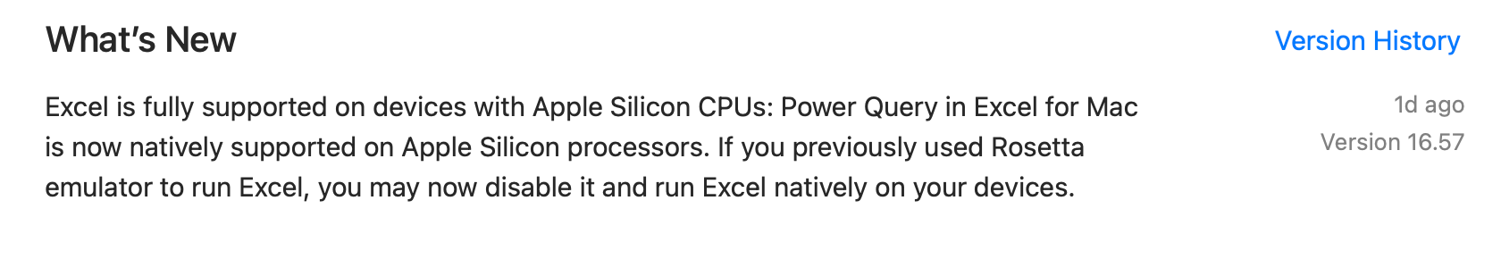 ตามบันทึกการอัปเดตแอปของ Excel เวอร์ชัน 16.57 ใน Mac App Store ที่พึ่งปล่อยอัปเดตไปล่าสุด ชี้ว่าในตอนนี้ Excel สามารถทำงานแบบ Native บน Mac รุ่นชิป M1, M1 Pro และ M1 Max โดยไม่ต้องใช้การแปลงผ่าน Rosetta 2 แล้ว