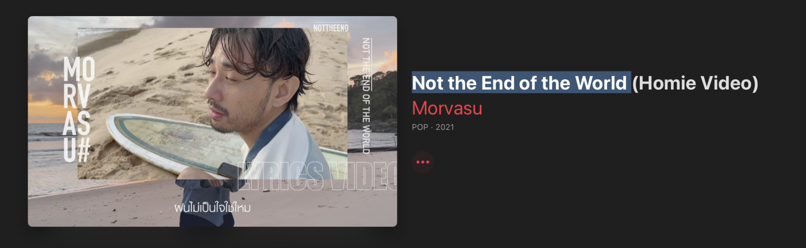 7 พฤษภาคม 2021 – Apple Music ชวนมอร์วสุ ศิลปินหนุ่มมากความสามารถและผู้กำกับภาพยนตร์โฆษณาชื่อดัง มาทำเพลงพิเศษ พร้อมถ่ายทำวีดีโอสวย ๆ ให้แฟน ๆ ได้ชม โดยมอร์วสุเลือกพลงฮิตอย่าง “โลกยังไม่แตก (Not the End of the World) ” ของวงออลเทอร์นาทิฟร็อก Ten to Twelve ที่เค้าเป็นนักร้องนำมาทำใหม่ ถ่ายทอดอารมณ์ในแบบฉบับของเค้า พร้อมปล่อยวีดีโอที่ถ่ายทำด้วย iPhone บอกเล่าเรื่องราวภายใต้แนวคิด “น้ำทะเลจะเยียวยาทุกสิ่ง”
