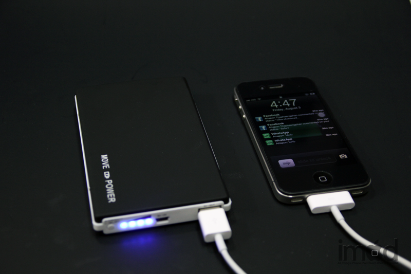 สำหรับ Move Power ก็เป็นแบตพกพาที่มีขนาดค่อนข้างไม่ใหญ่มาก (เมื่อเปรียบเทียบกับ iPhone4 จะเห็นว่าใหญ่กว่าไม่มากเลย) และน้ำหนักประมาณ 200g แต่ได้ความจุมากถึง 10,500 mAh สำหรับท่านใดที่ต้องเดินทาง หรืออกข้างนอกบ่อยๆ หาที่ชาร์จไม่ค่อยจะได้ Move Power เป็นอีกหนึ่งตัวเลือกที่น่าสนใจไม่ใช่น้อยครับ