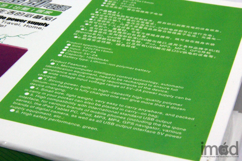 สำหรับขนาด 120 x 75 x 15 mm หลายๆท่านอาจจะยังนึกภาพไม่ออกว่าใหญ่ เล็กขนาดไหนนะครับ ไว้รอเปิดกล่องเรามาดูด้วยกัน ด้วย output 5V-2A ทำให้สามารถชาร์จ iPad ได้ด้วย และสุดท้าย แบตเตอรี่ประเภท Lithium Polymer หลายๆท่านอาจจะเคยคุ้นๆหูมาอยู่บ้างนะครับ