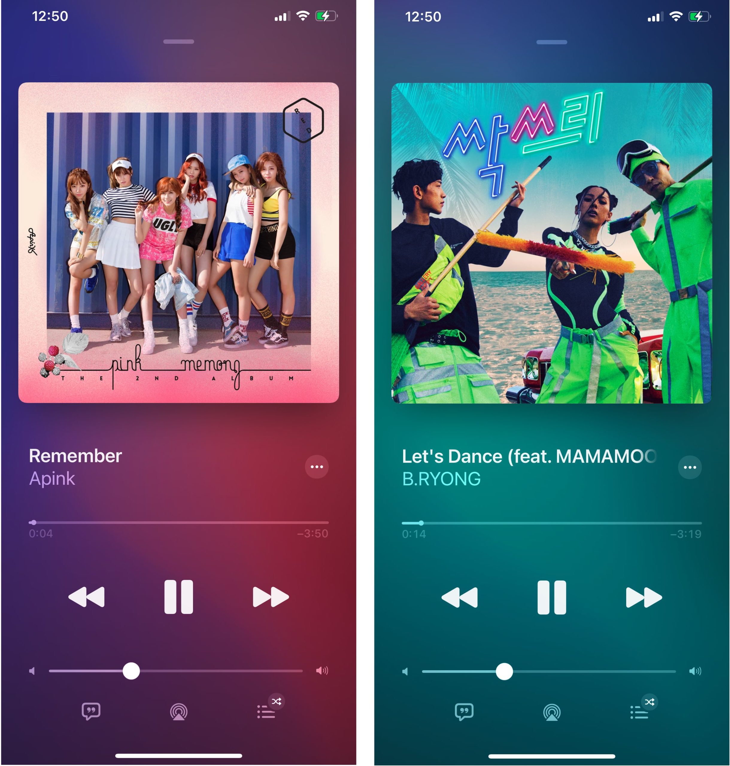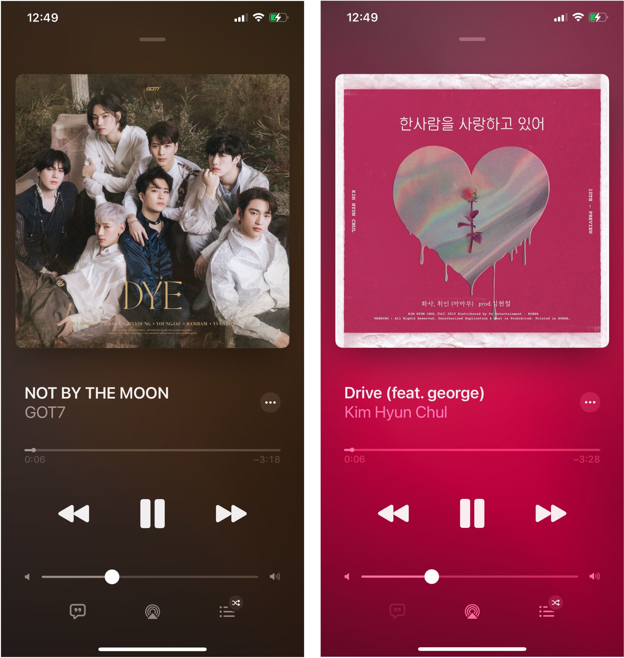 ปกติแล้วใน iOS 13 จะมีพื้นหลังโทนเดียว แต่ใน iOS 14 พื้นหลังจะค่อย ๆ เปลี่ยนสีตอนที่เราเลื่อนเปลี่ยนไปเล่นเพลงอื่น, อัลบั้มอื่น โดยพื้นหลังจะอ้างอิงกับ Artwork ของเพลงที่เราเล่นอยู่