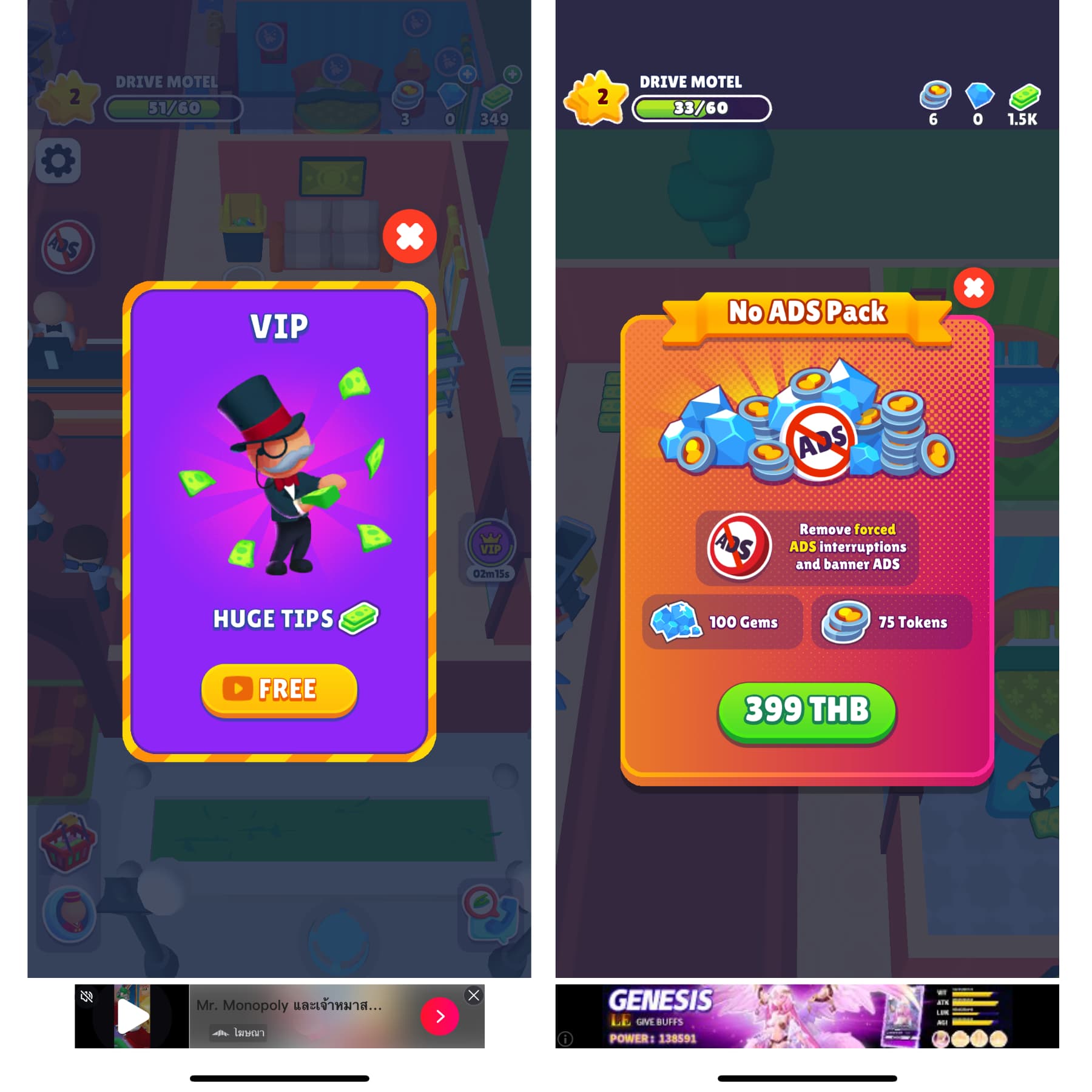 ระหว่างเกมอาจมีโฆษณาเล็กน้อย หากอยากเล่นเกมแบบไม่มีโฆษณาจะต้องเสียเงิน 399 บาท