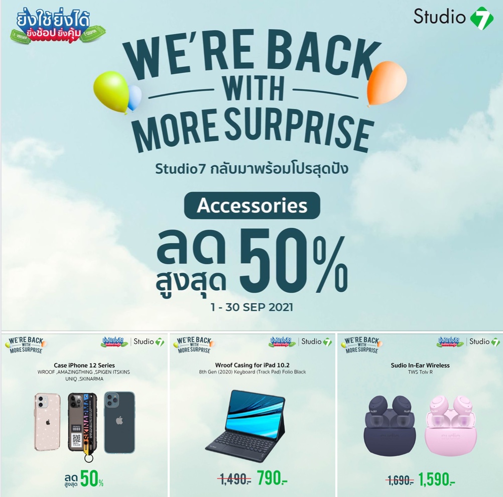 Studio 7 WE’RE BACK WITH MORE SURPRISE กลับมาพร้อมโปรสุดปัง Gadget & Accessories ลดสูงสุด 50% วันที่ 1 – 30 ก.ย. 64 พบกันที่ Studio 7 สาขาใกล้บ้าน