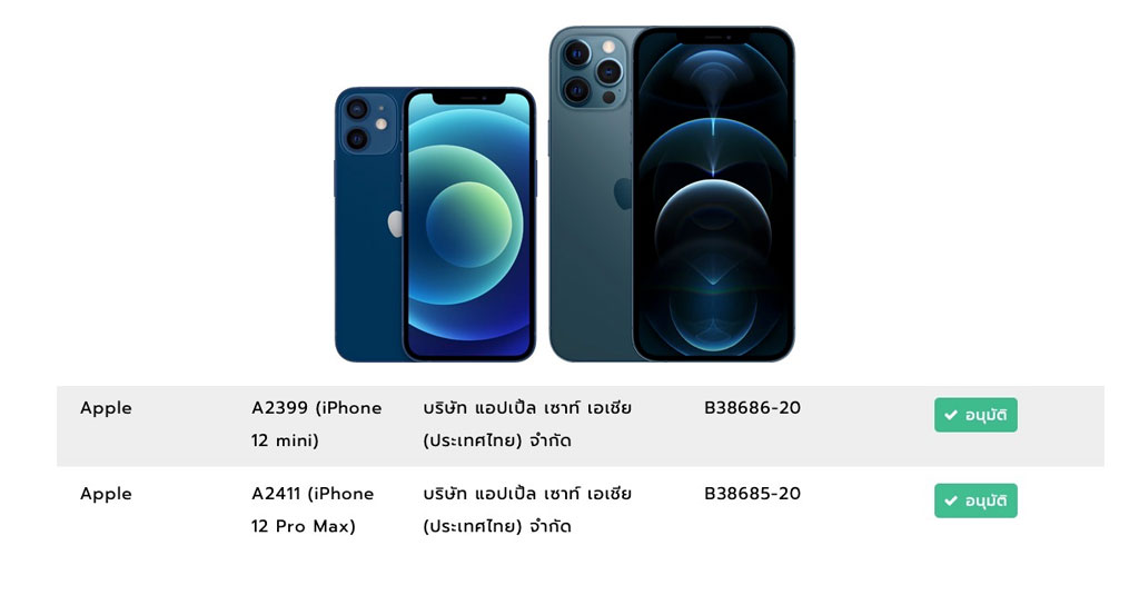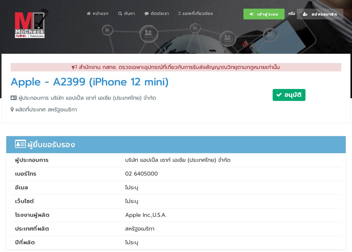 เมื่อเข้าไปตรวจสอบที่เว็บไซต์ของ กสทช. (MoCheck) พบว่า กสทช. อนุมัติใบรับรอง iPhone 12 mini, iPhone 12 Pro Max แล้ว
