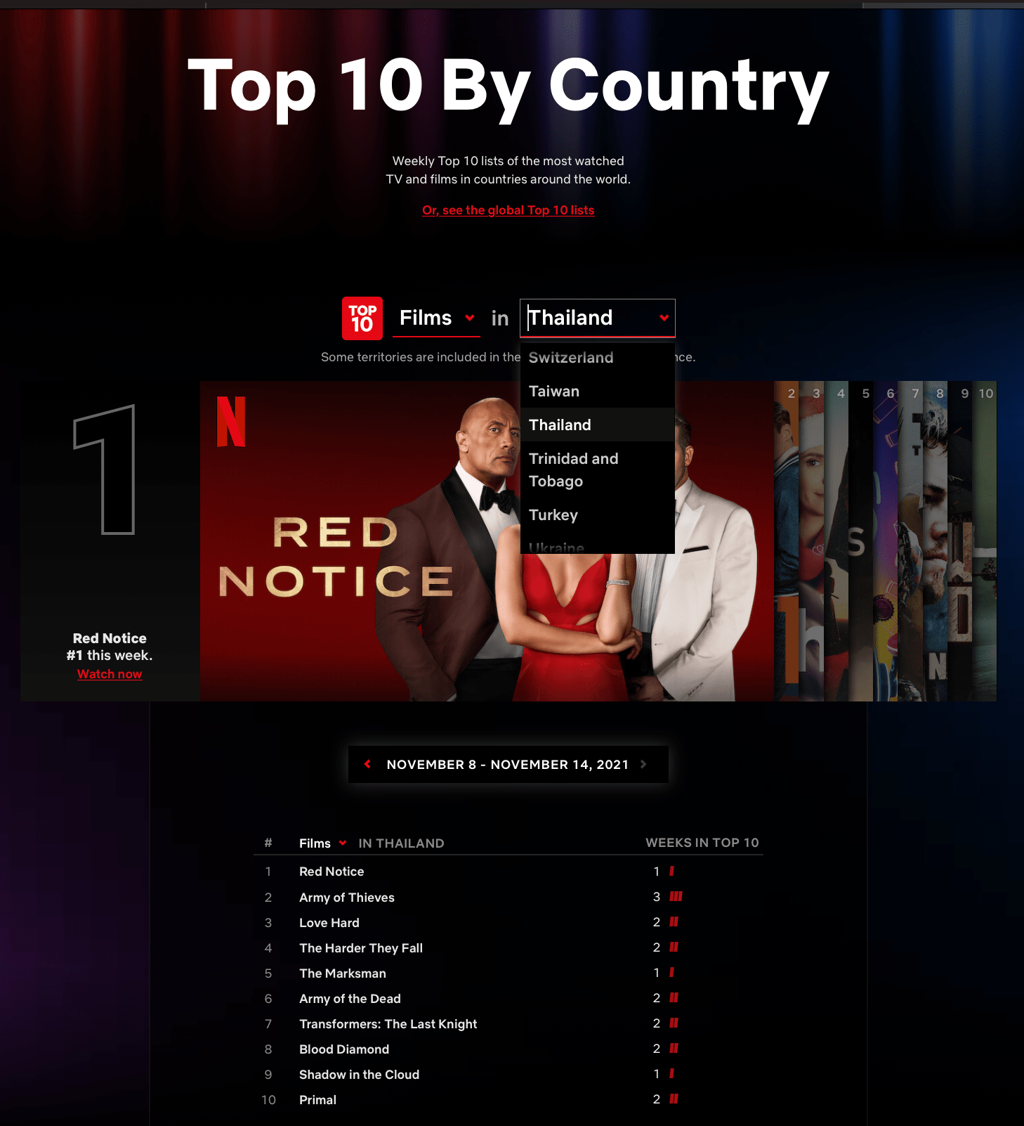 หากเข้าไปที่หน้าเว็บไซต์ https://top10.netflix.com เราจะสามารถดู 10 อันดับยอดนิยมของภาพยนต์และซีรีส์บน Netflix ได้ เลือกดูได้ทั้งแบบทั่วโลก หรือจะเลือกดูของแต่ละประเทศก็ได้ ประเทศไทยก็มีให้เลือกดู
