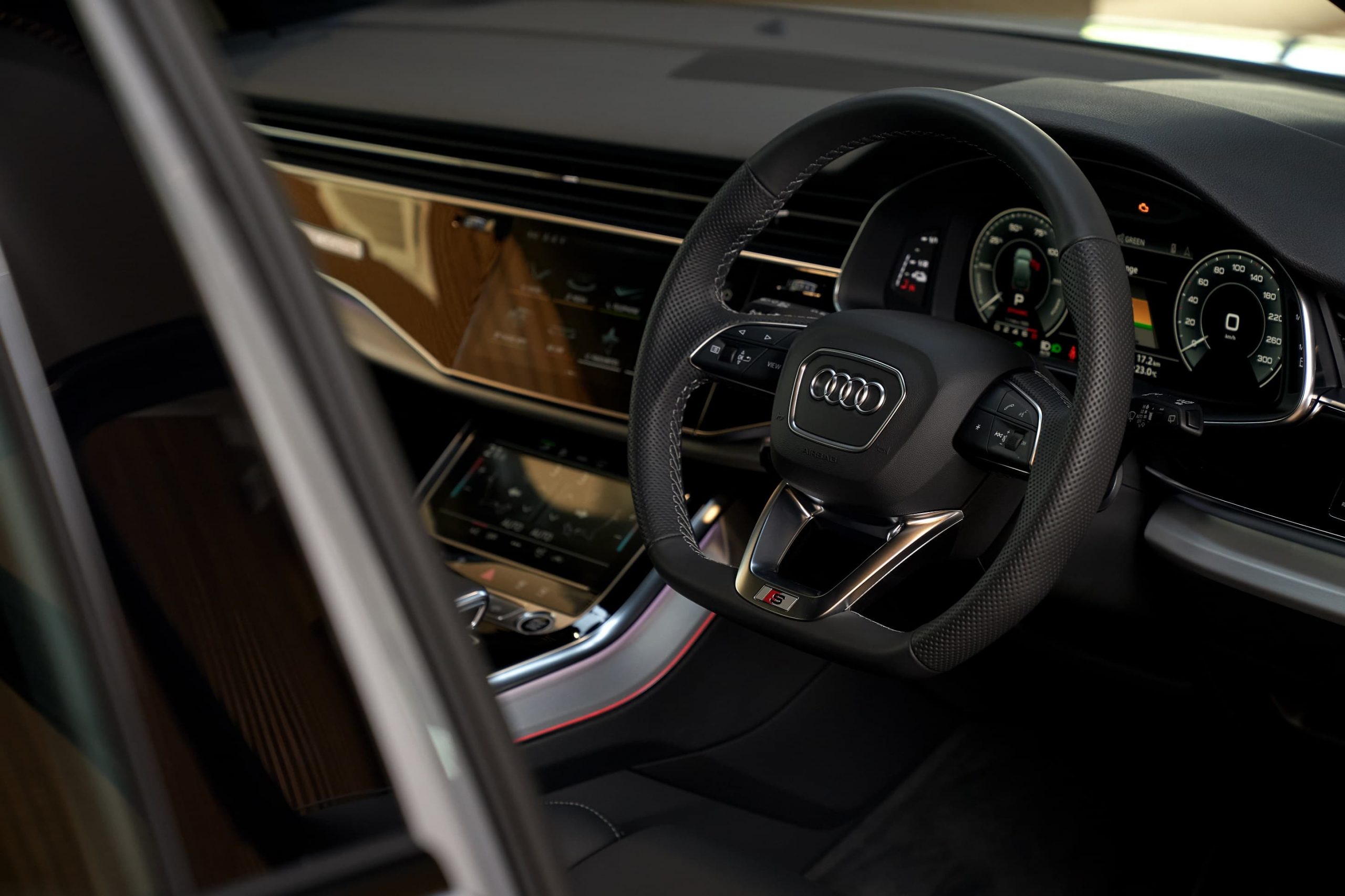 ในรุ่น Audi Q7 60 TFSI e quattro S line Black Edition ภายในได้เพิ่มอุปกรณ์การตกแต่งเป็นแบบ S line Interior พวงมาลัยท้ายตัดพร้อมเบาะนั่งพร้อมตราสัญลักษณ์ S line