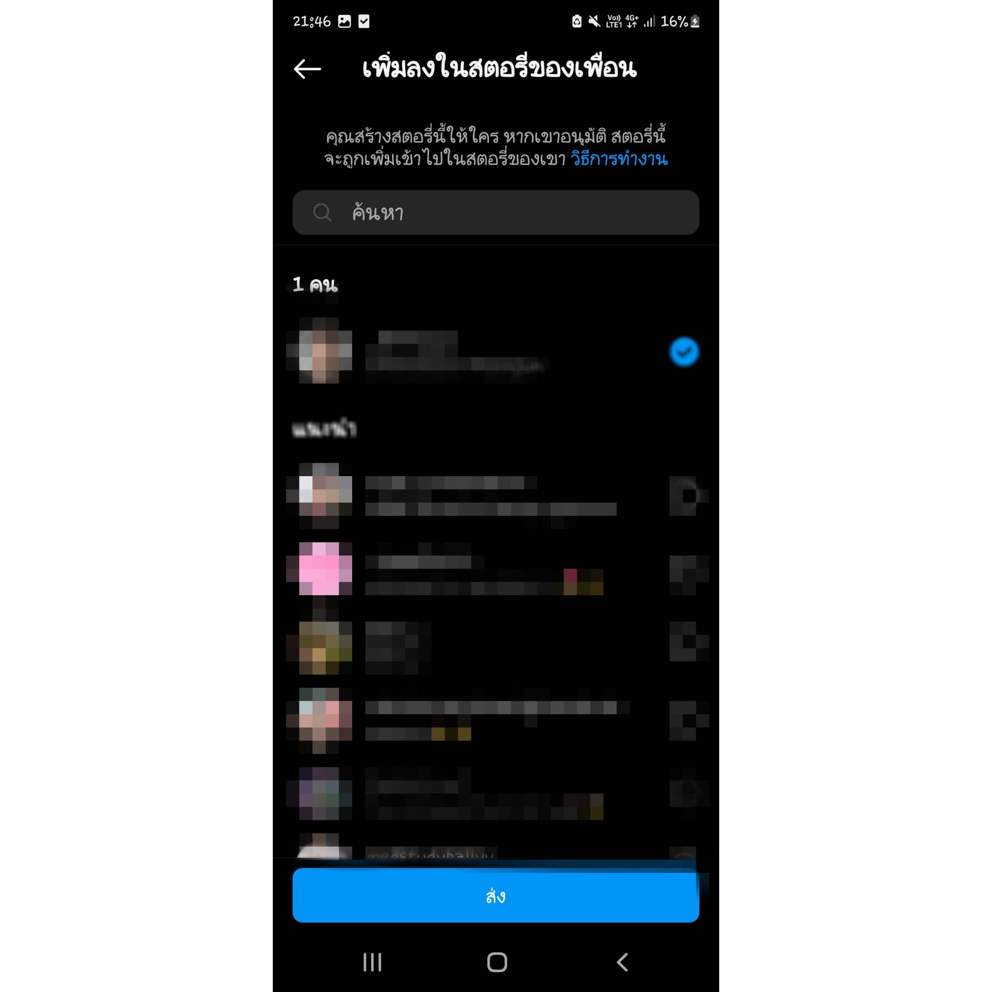 พอเรากดเข้าไปแล้วให้ “เลือกเพื่อนที่ต้องการสร้างสตอรี่ให้” จากนั้น “กดส่ง”